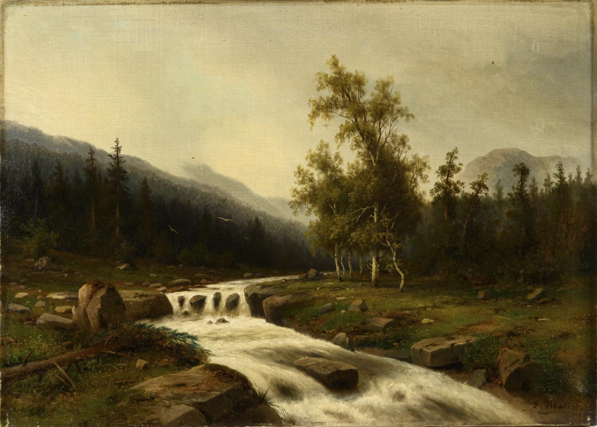 Reißender Fluss zwischen großen Felsen und angrenzenden Nadelwäldern. Leichte Altersspuren.