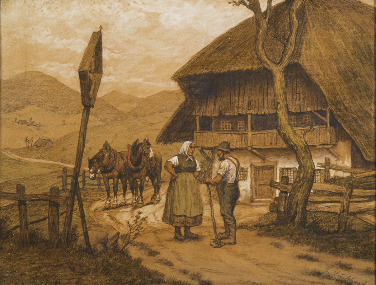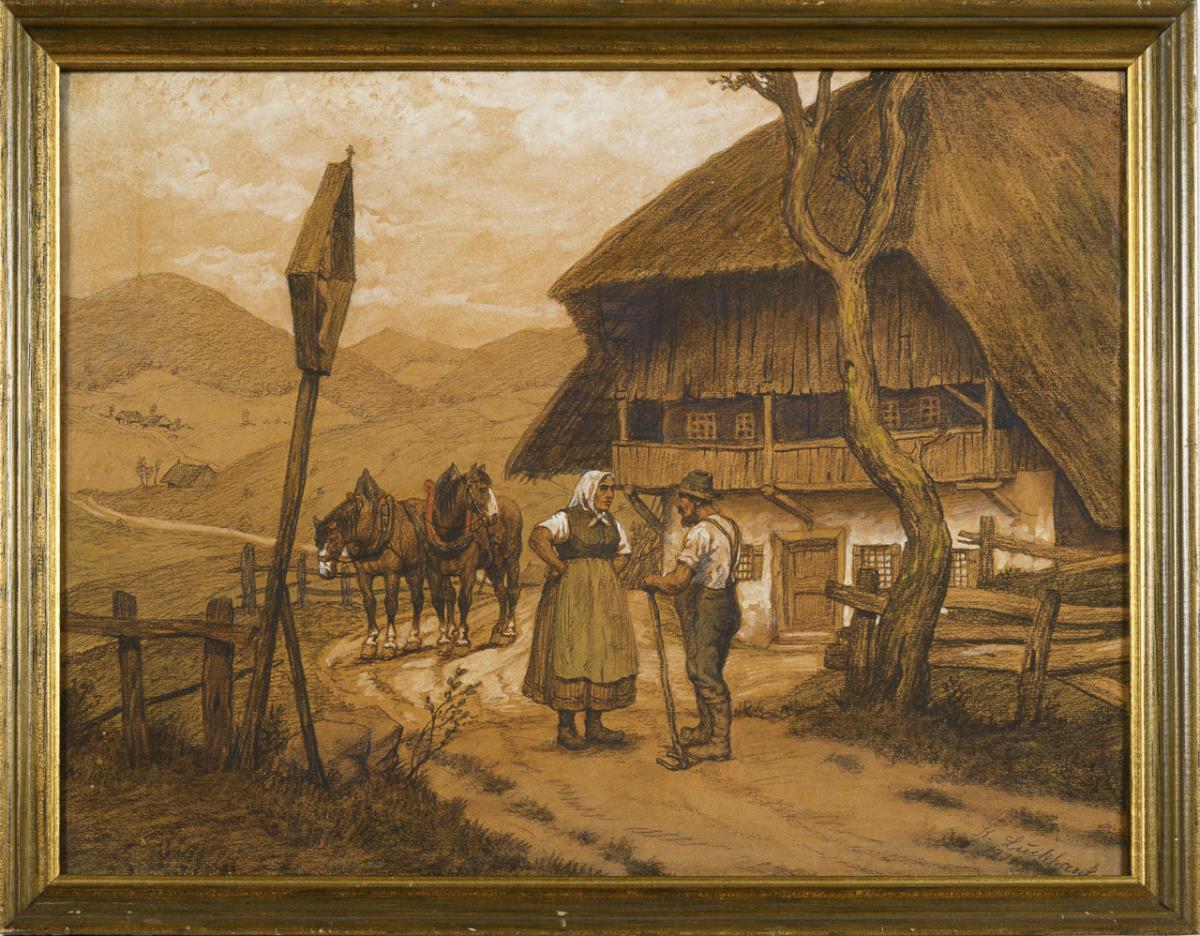 Das Paar vor dem Haus nahe dem Gespann im Gespräch.