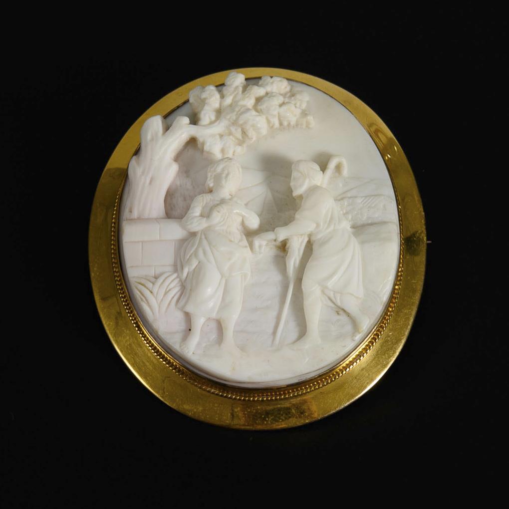 Zargengefasste Kamee mit geschnittenem christlichen Motiv "Rebekka und Elieser am Brunnen" mit breitem Rahmen und reliefiertem Kordelrand. Hakenverschluss, kleine starre Öse.