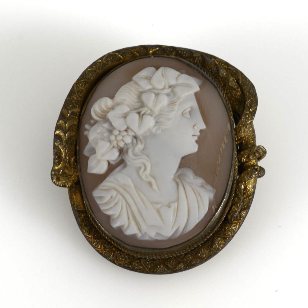 Zargengefasste Kamee mit antikisierend geschnittenem Profilkopf der Göttin Flora, mit reliefierter Rahmenzier in Schlangenform. Hakenverschluss. seitlicher Haarriss.