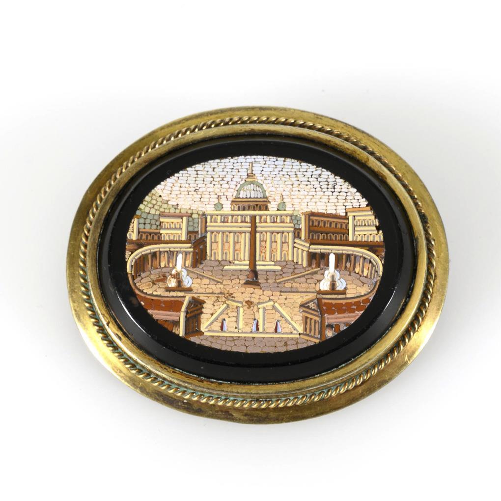 Eingelegtes Glasmosaik mit Motiv des Petersdom in Rom, zargengefasst mit kordelverziertem Rahmen. Hakenverschluss. Kleine Fehlstellen am Rand.