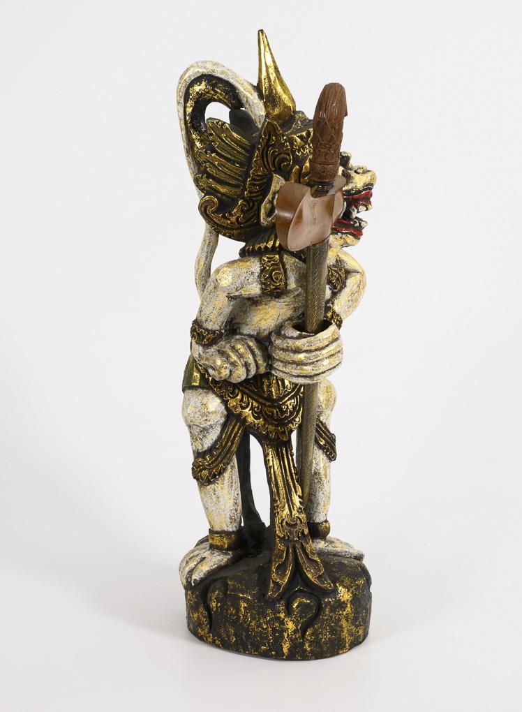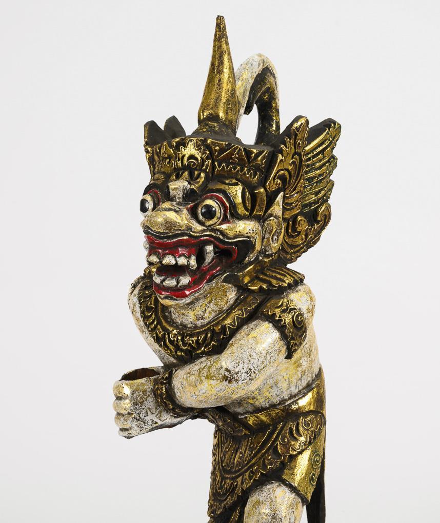 Gewellte Klinge mit schönem pamor, ausgeprägter 'Elefantenrüssel'. Geprägter mendak, beschnitzter Holzgriff. Wrangka Yogyarkata. Scheide mit geschlossenem Messing-pendok, fein gemustert. / Farbig gefasster Holzständer in Form eines mythologischen Affen, nach alten Vorbildern geschnitzt.