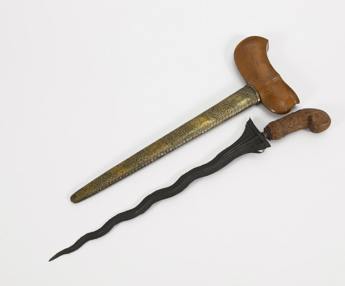 Sie befinden sich hier:   Startseite Kategorien Außereuropäische Kunst Keris Luk 9 mit Scheide und jüngerem Ständer in Affenform