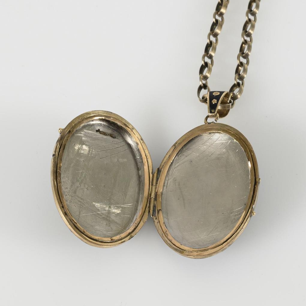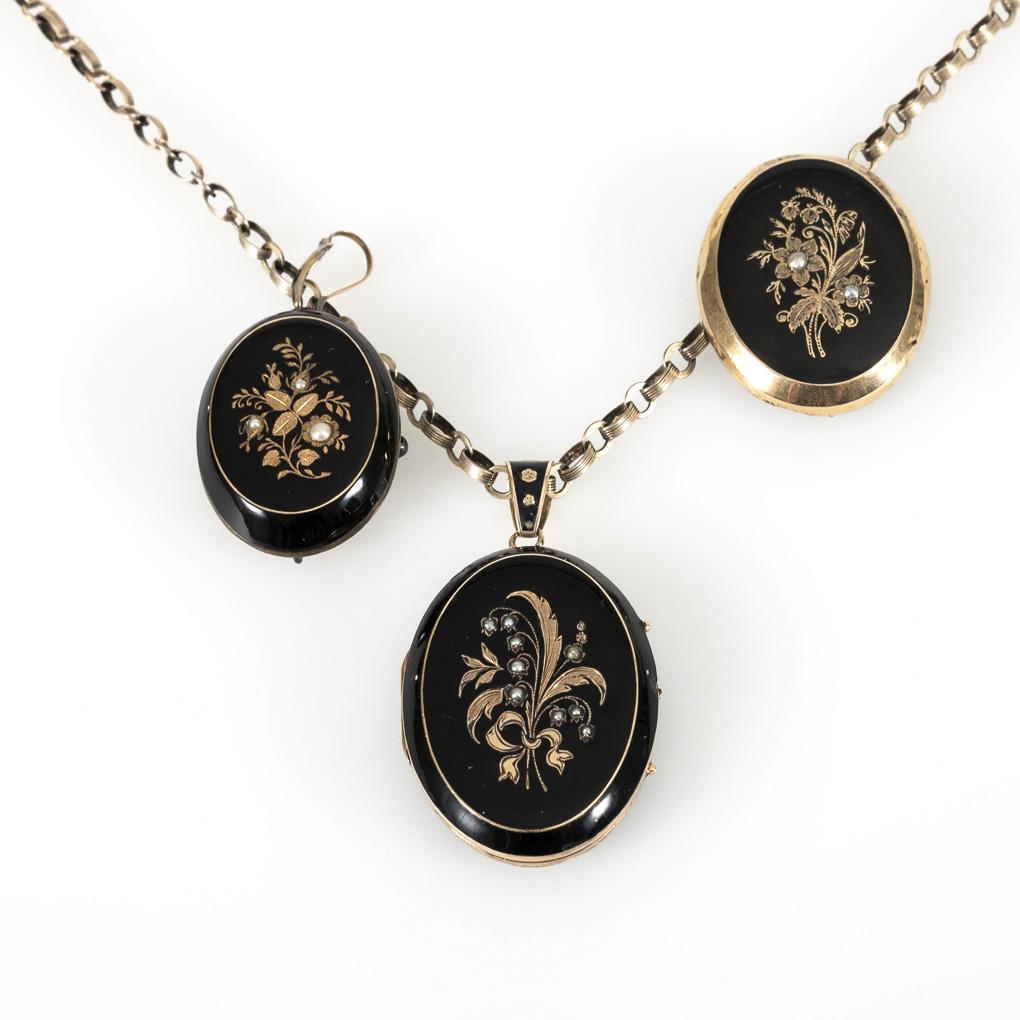 Emaillierte Anhänger mit perlchenbesetzten Gravuren. 1x 2 Innenfächer mit gerahmter Verglasung (1 Verglasung fehlt). 2 mit verglast gerahmten Rückseiten. Scharnierösen, 1 Broschierung. Ankerkette mit Steckschließe. 1 Anhänger mit Randdellen und entfernter Broschierung.