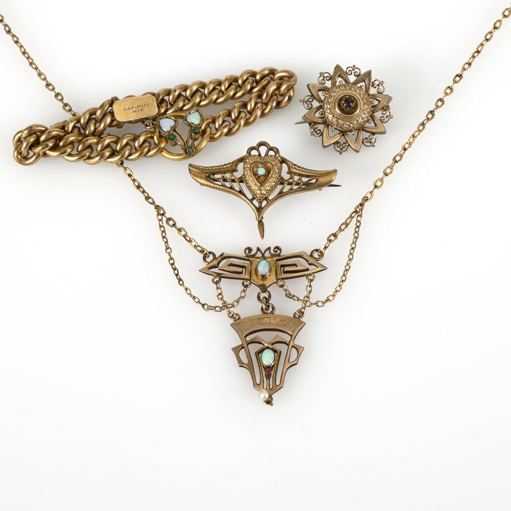 Stiltypisches Collier, Panzerarmband und Brosche mit Opalcabochons und Ornamentbrosche mit Granat. Ankerkette, Kastenschloss mit Sicherheitskette, Hakenverschlüsse.