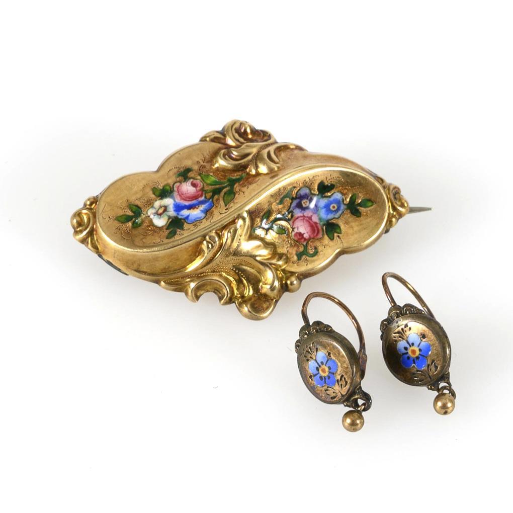 Biedermeierbrosche und Ohrhängerpaar mit Email.