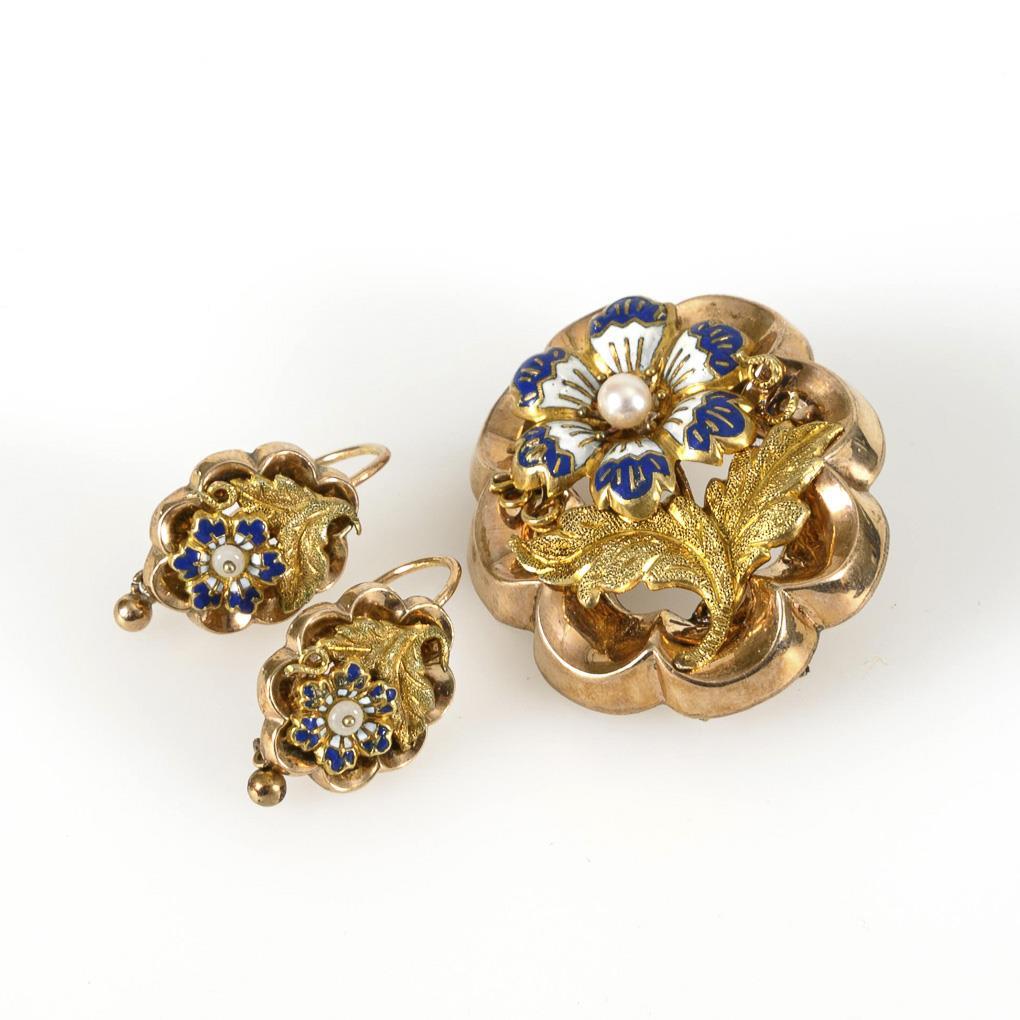Reliefierte Brosche mit montierter, emaillierter Blume und kleiner Zuchtperle. Ergänzter Kugelhaken. Passendes Ohrhängerpaar mit Bügel.