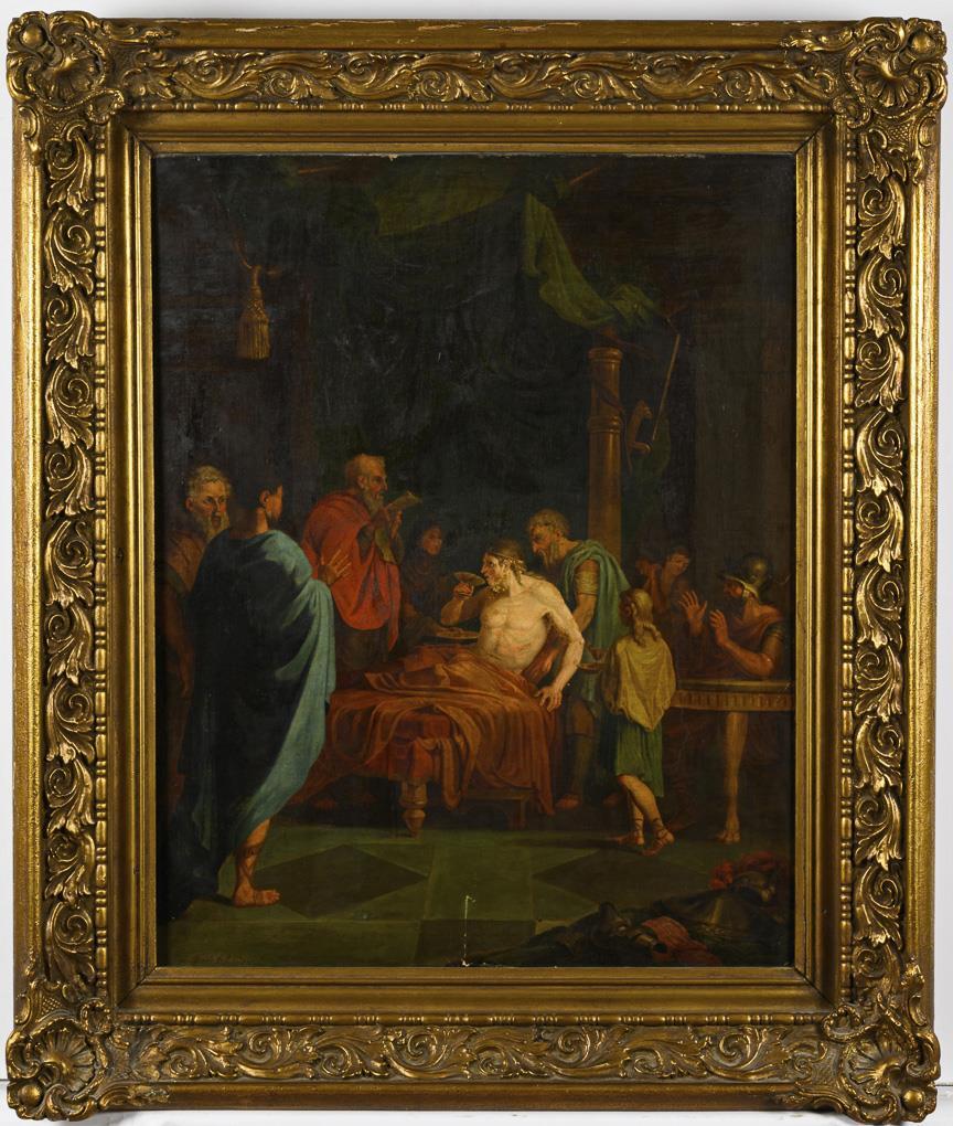 Der geschwächte makedonische König beim Trinken und Zuhören auf dem Bett, während andere Berater und Ärzte um ihn stehen. Leinwand doubliert.