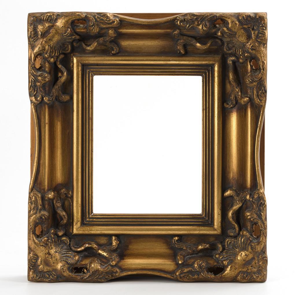 Holz, goldbronzierter Stuck. Lichtmaß 23,5 x 18,5 cm, Falzmaß 25,5 x 20,5 cm, Außenmaß 45 x 40 cm.