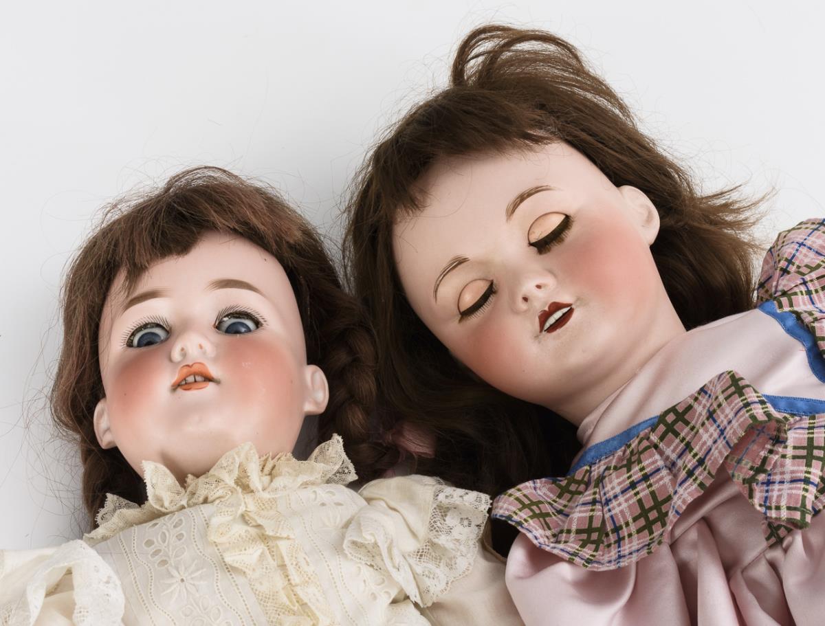 Beide mit Kurbelkopf, Schlafaugen, Echthaarperücke und Gliederkörper. Die größere Französin mit jünger ergänztem rosa Kleid. L 70 cm. Die kleinere Puppe mit Reparaturen am Körper, Schlafaugen verklemmt (Wachslider defekt). In weißem Kleid. L 59 cm. Köpfe durchleuchtet: ohne Defekte, lediglich bei der Französin 1 minimaler Chip an der Halskurbel.