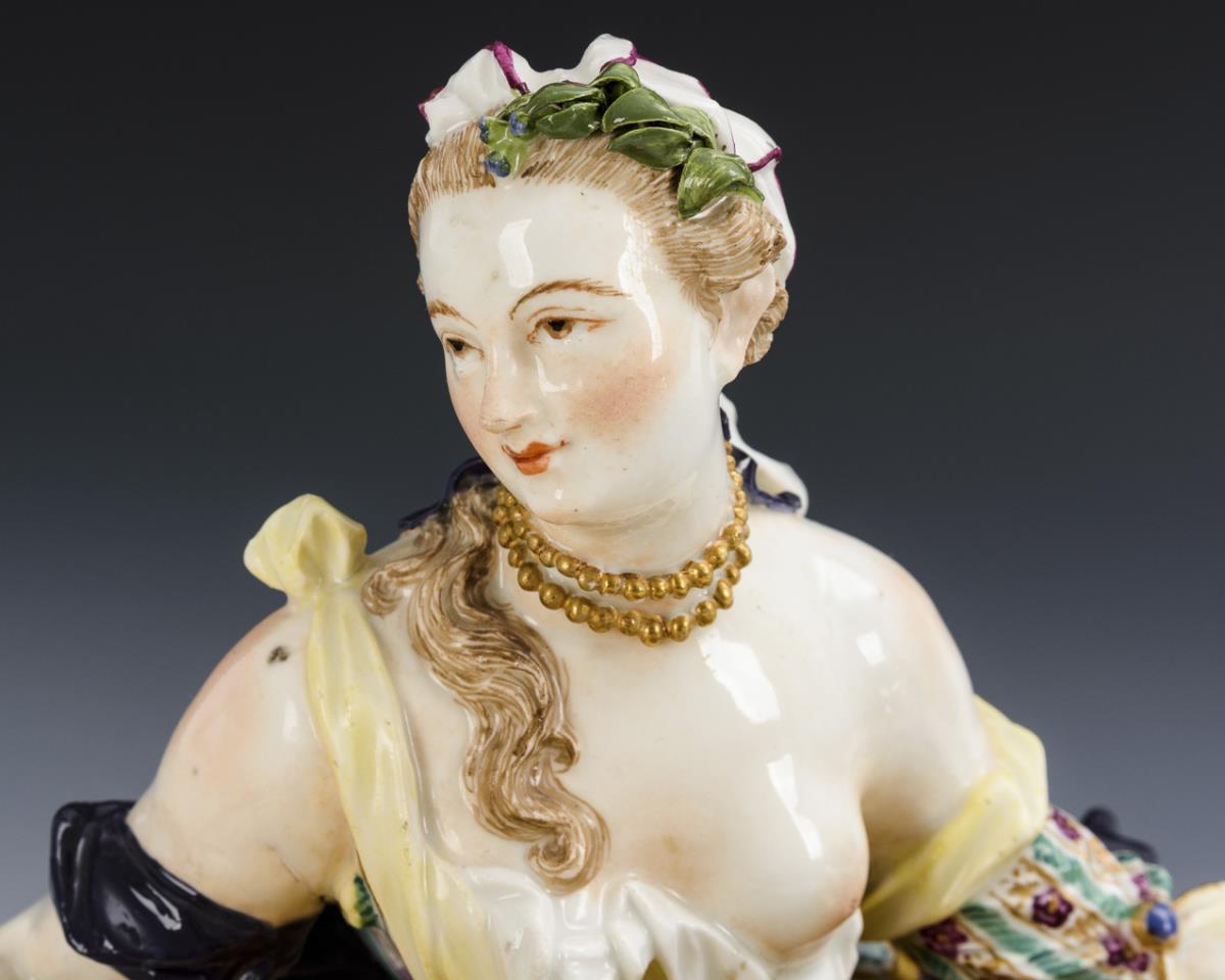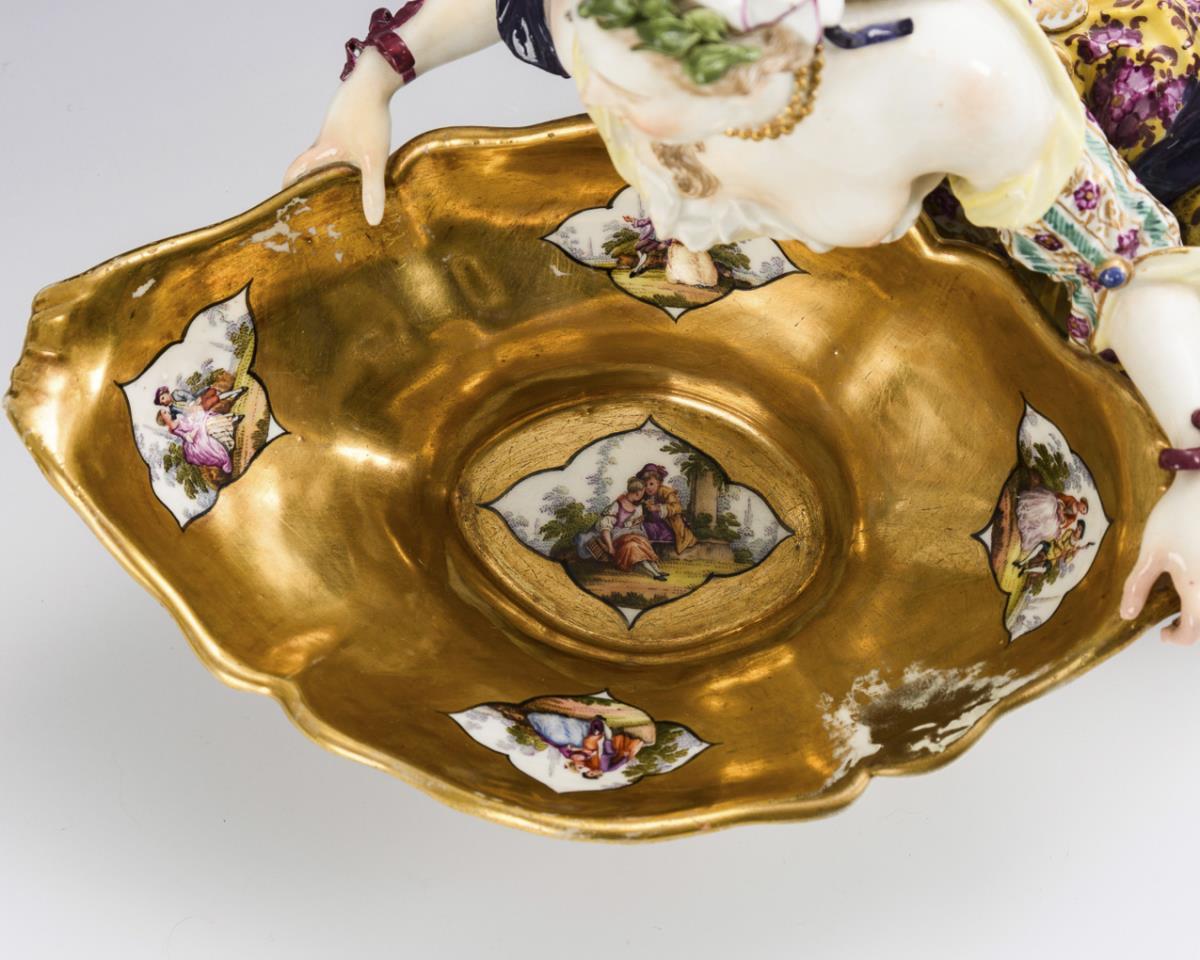 Sockel restauriert, beide Beine, Tuchdraperie, beide Hände, Schalenrand und Pflanzenschmuck auf dem Kopf restauriert, minimaler Goldabrieb.