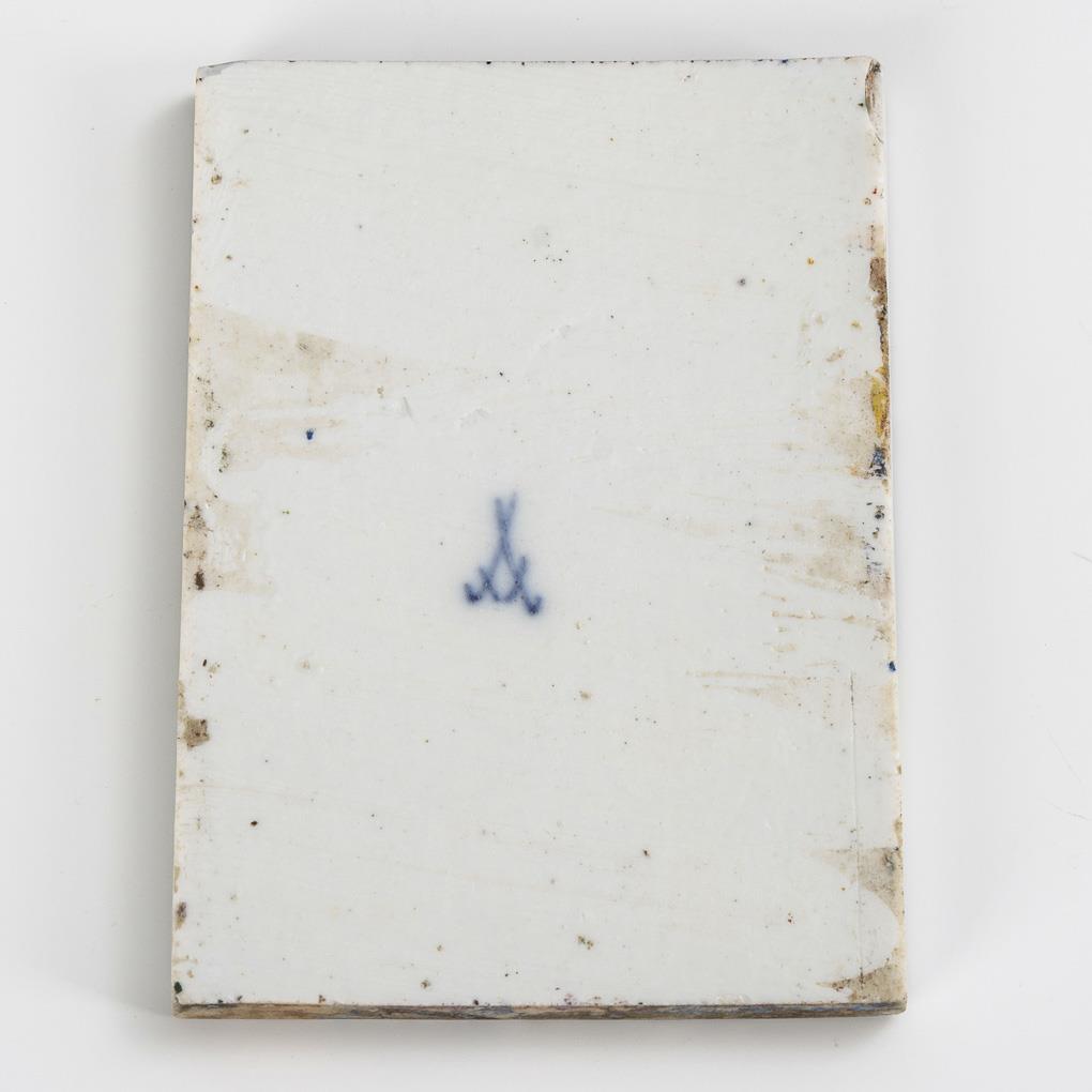 1x kleine rechteckige, leicht gewölbte Plakette mit beidseitiger Watteau-Malerei (3,6 x 4,8 cm; Einsatz für einen Tabatierendeckel). / 1x Meissen: rechteckige Plakette mit der Darstellung eines Reiters in einer Landschaft (6,8 x 9,3 cm). 1x mit Farbabplatzern und 2 Randbestoßungen.
