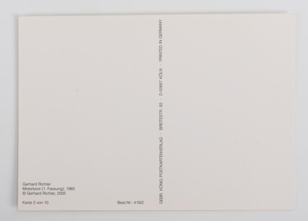 Handsignierte Ansichtskarte nach dem Gemälde "Motorboot (1. Fassung)" von 1965, verso unbeschriftet.
