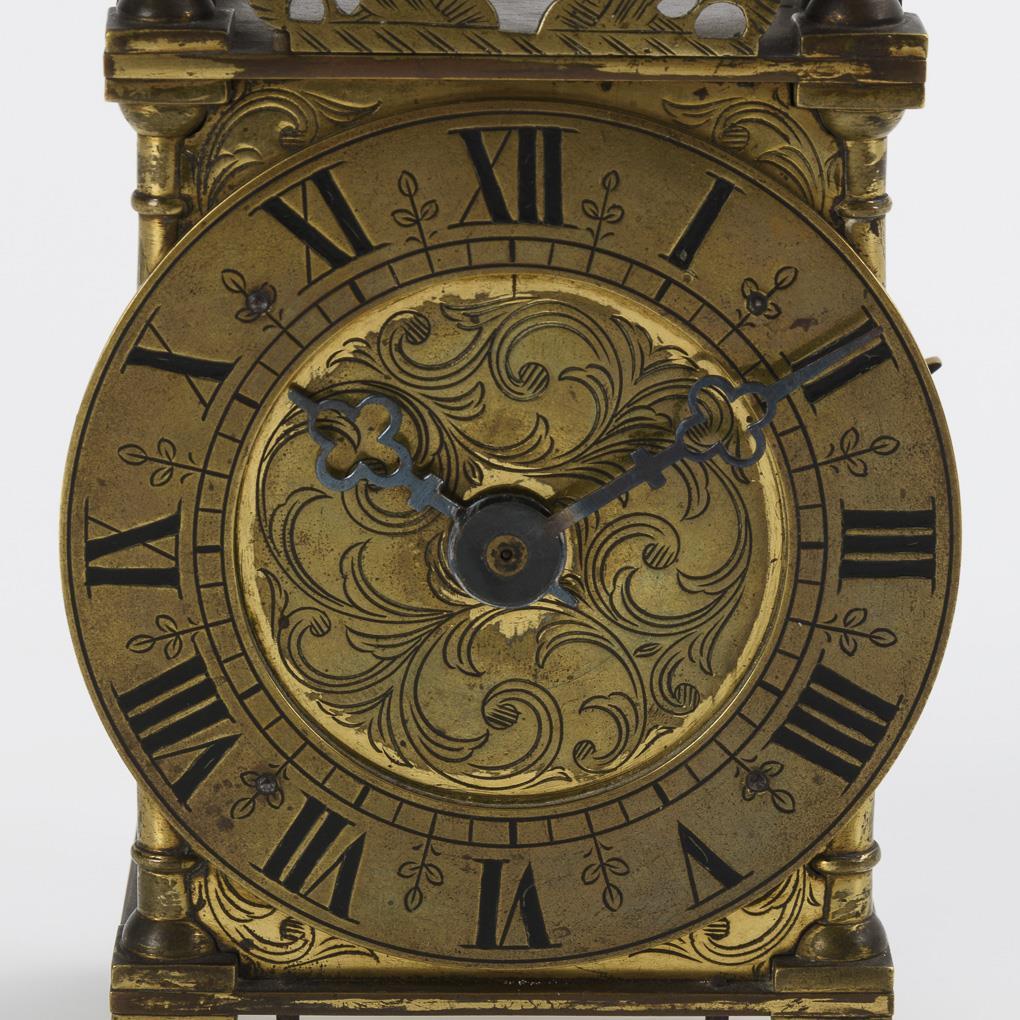 Architektonisches Gehäuse im Barock-Stil, offenes Kuppeldach mit großer Metall-Glocke und durchbrochen gefertigten, teils gravierten Zierblenden, auf 4 Kugelfüßchen. Wohl als Export-Artikel gefertigt. Teils berieben.