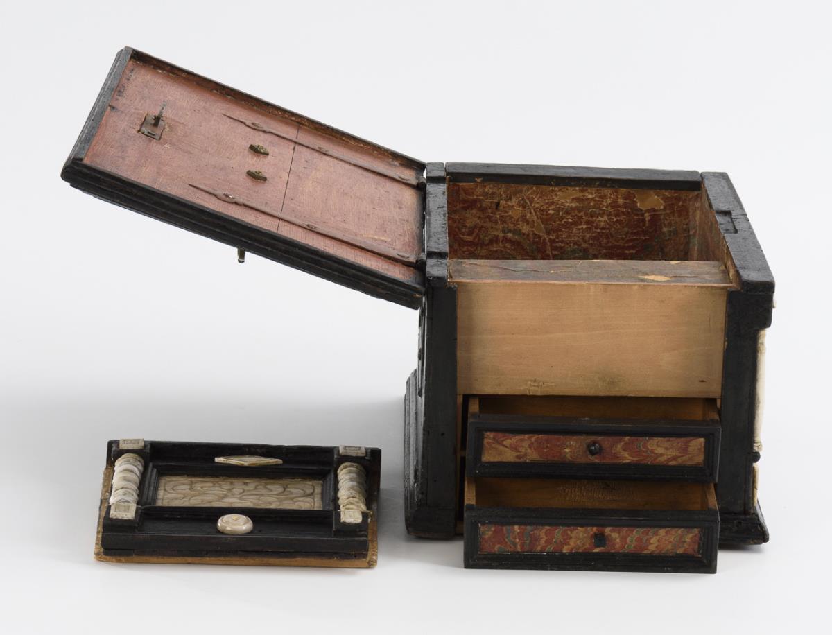 Miniaturtruhe mit von Halbsäulen rhythmisierter architektonischer Gliederung in der Front und an den Seiten; auf der Rückseite Kassette mit Alabaster-Füllung. Gerader Scharnierdeckel mit Scharniergriff über zentraler Ornament-Kassette, flankiert von 2 Kassetten mit Schachbrettmuster. Innen alt mit rotem Marmorpapier ausgeschlagen sowie kleine Beilade mit Klappdeckel. Mehrere Geheimfächer mit Schubfächern. Schloss fehlt, restauriert mit einigen Ergänzungen, Alters-/Gebrauchsspuren.