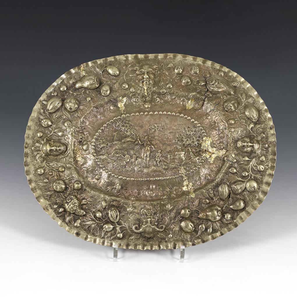 Ovale, fein ziselierte und getriebene Platte mit mythologischer Szene im Zentrum, Maskarone und Früchte am Rand. Mit Defekten und alten Reparaturen.