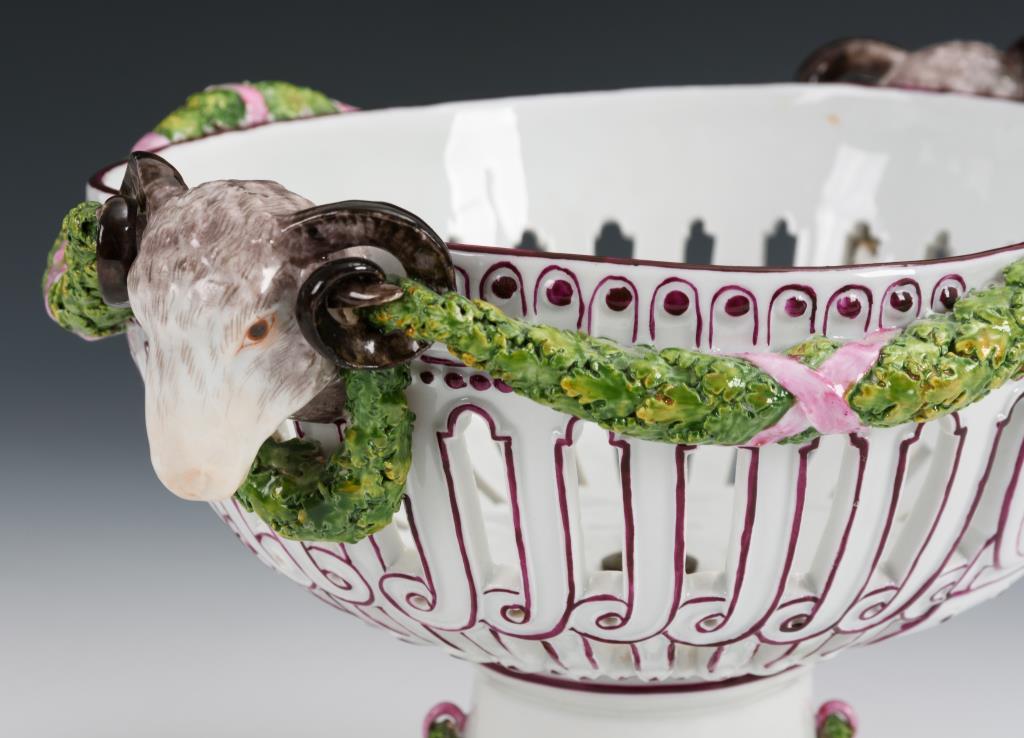 Stabartig durchbrochener Korb mit Rundfuß, zwei Widderkopfhandhaben und Lorbeerfestons.