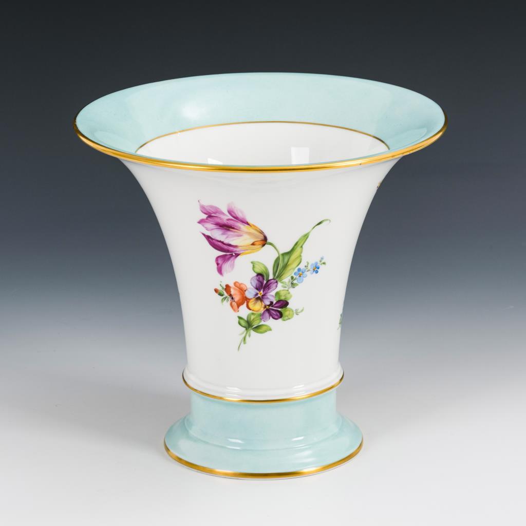 Kratervase mit türkisblauen Fondbändern und Blumenbuketts. Minimale Farbabplatzer.