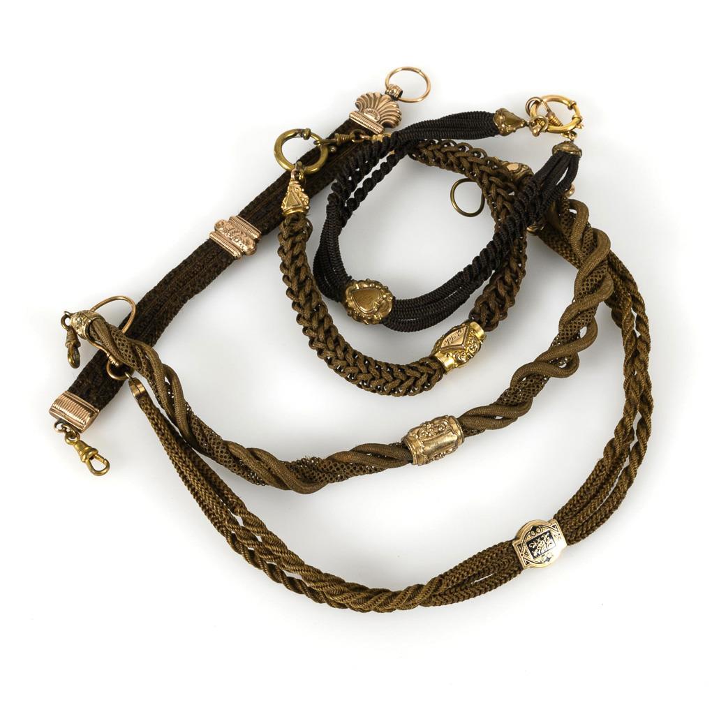 Geknüpfte, teils mehrreihige Ketten mit reliefierten Montierungen, Einhängehaken, Ringfederschließen und Karabinerhaken.
