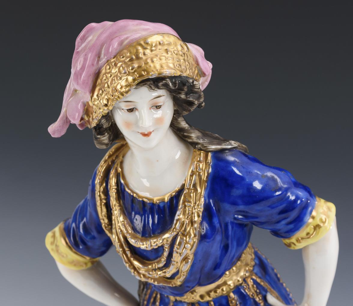 Auf einem Rundsockel stehende Orientalin. Minimaler Goldabrieb, minimale Bestoßung an den Fransen.