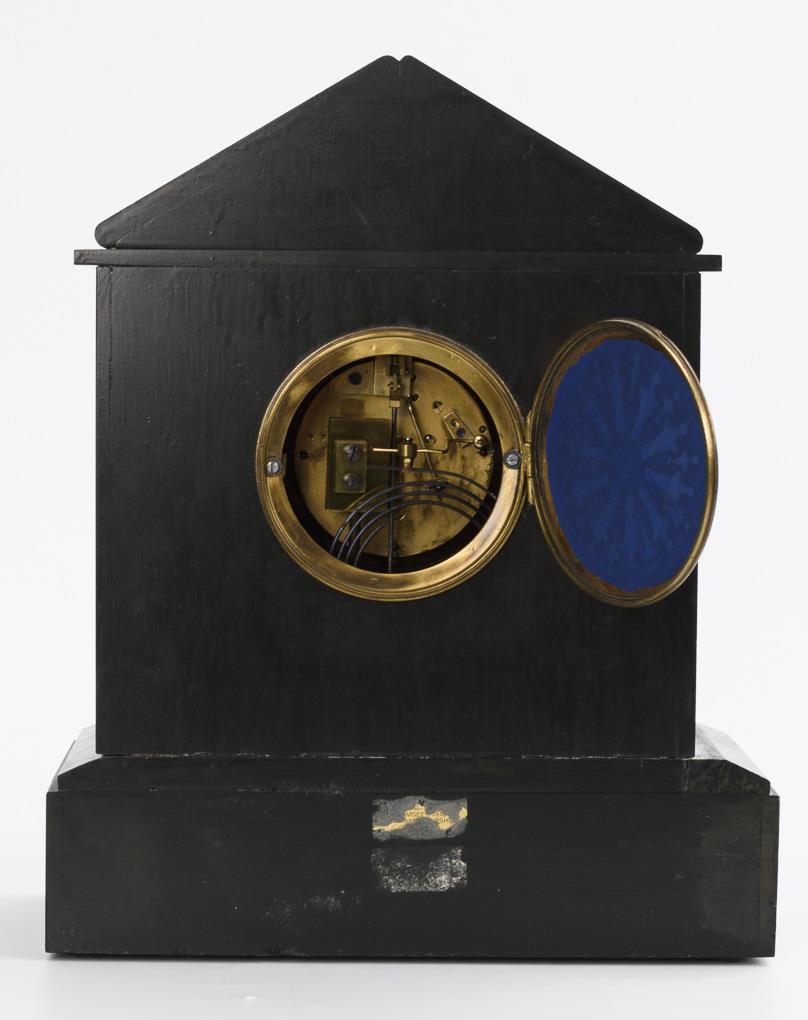"F. Marti" gemarktes Werk mit Halbstundenschlag auf Tonfeder. Läuft nicht. Weißer Emailzifferring mit arabischen Zahlen, Minutenkranz und Romaines-Zeigern, vertieftes Zentrum mit sichtbarer Brocot-Hemmung.