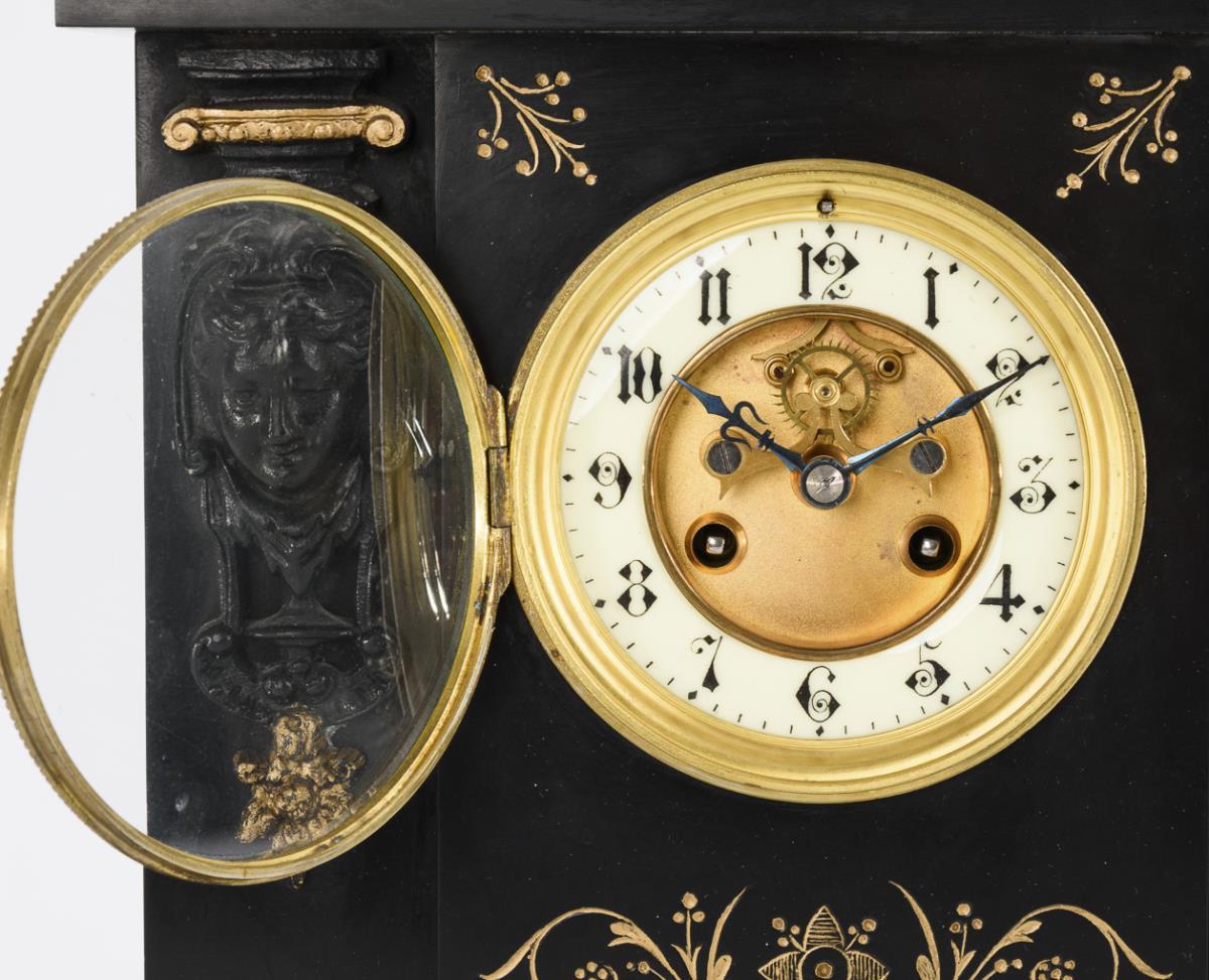 Dekorative schwarze Gründerzeituhr.