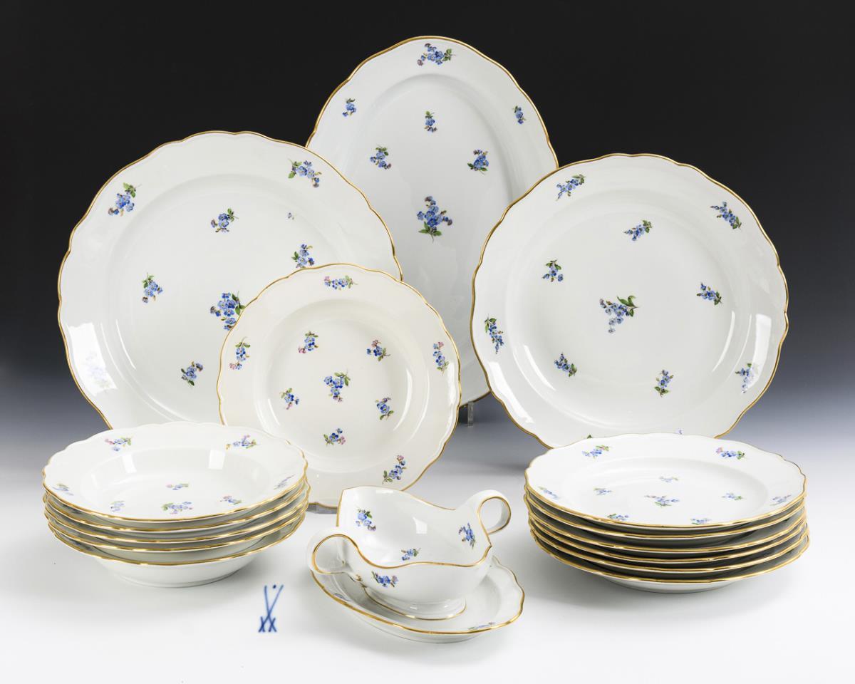 16 Teile eines Speiseservice mit Vergißmeinnichtdekor. Meissen.