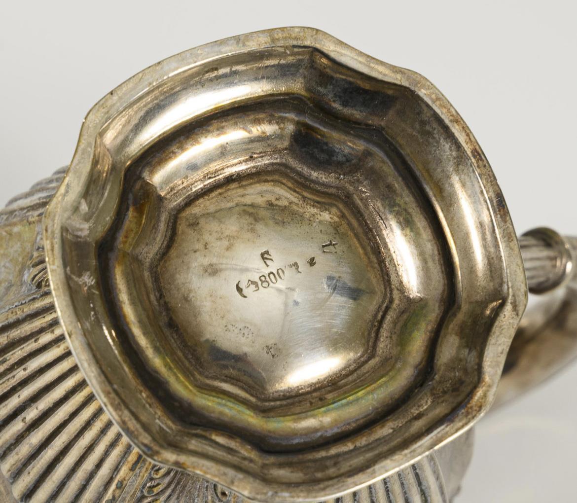 In klassizistischer Formensprache gestaltet: Kanne, Zuckerdose und Kännchen auf Tablett. Tablett und Zuckerdose gedellt.