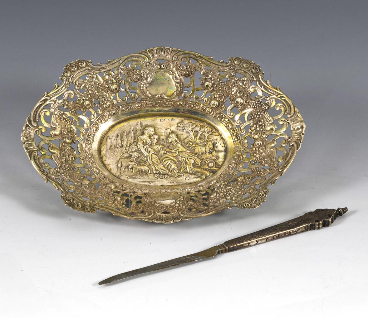 Kleines graviertes Messer mit Datierung "Feiken Kins - Anno 1623". Wohl Niederlande. L 17 cm, 26 g. / Ovales Durchbruch-Schälchen mit Schäferszene und Blütengirlanden (800/Halbmond Krone gepunzt). 3 x 17,5 x 12 cm, 105 g.