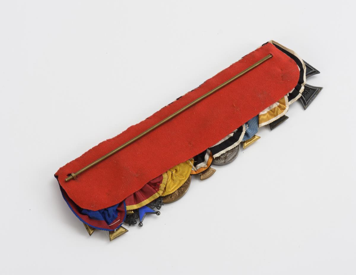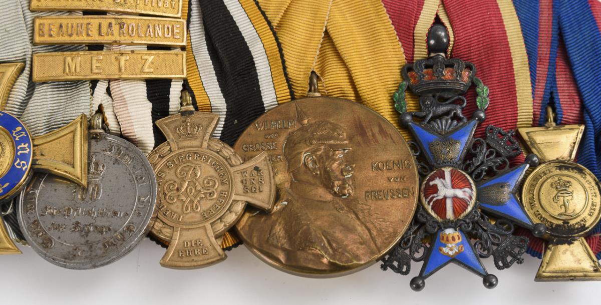 Nr. 1: Eisernes Kreuz von 1870/71 für Nichtkämpfer und 25jähriger Jubiläumsspange / Nr. 2: Roter Adler Orden (unter 3. Klasse) / Nr. 3: Königlicher Kronenorden 4. Klasse) / Nr. 4: Kriegsdenkmünze 1870/71 mit Spangen: "Cravelotte St. Privat; Beaune la Rolande; Metz" / Nr. 5: Erinnerungskreuz für 1866 / Nr. 6: Kaiser Wilhelm I. Erinnerungsmedaille, 1897 / Nr. 7: Herzoglich Braunschweigischer Orden Heinrichs des Löwen, Metall Variante / Nr. 8: Oldenburger Haus- und Verdienstorden Ehrenkreuz 1. Klasse.