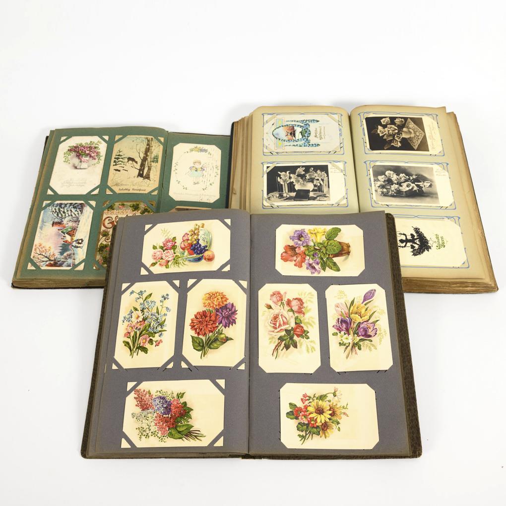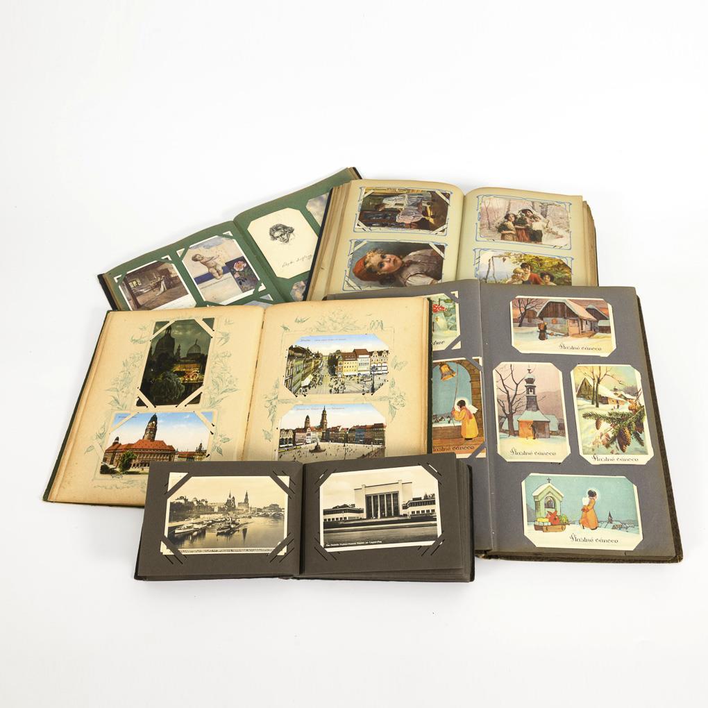 Tschechische Künstlerkarten, ca. 102 Ansichtskarten mit Weihnachts- und Blumenmotiven, einige Motive doppelt, wohl um 1920/30, im grau-braunem "Album". / Ca. 184 Ansichtskarten mit Motiven, Künstlerkarten und Kitschkarten, im braunen "Album" mit rosa Blüten. / 2x Postkartenalbum mit Sachsen und Dresden, insgeamt ca. 200 Ansichtskarten um 1920/30, teils farbig. Im kleinen karierten Album, und im grünen Album mit weißen Blüten und Seelandschaft. / Ca. 396 Motivkarten, Kitsch- und Glückwunschkarten, teils geprägt, um 1920, im blauen "Postkarten Album" mit Blüten.