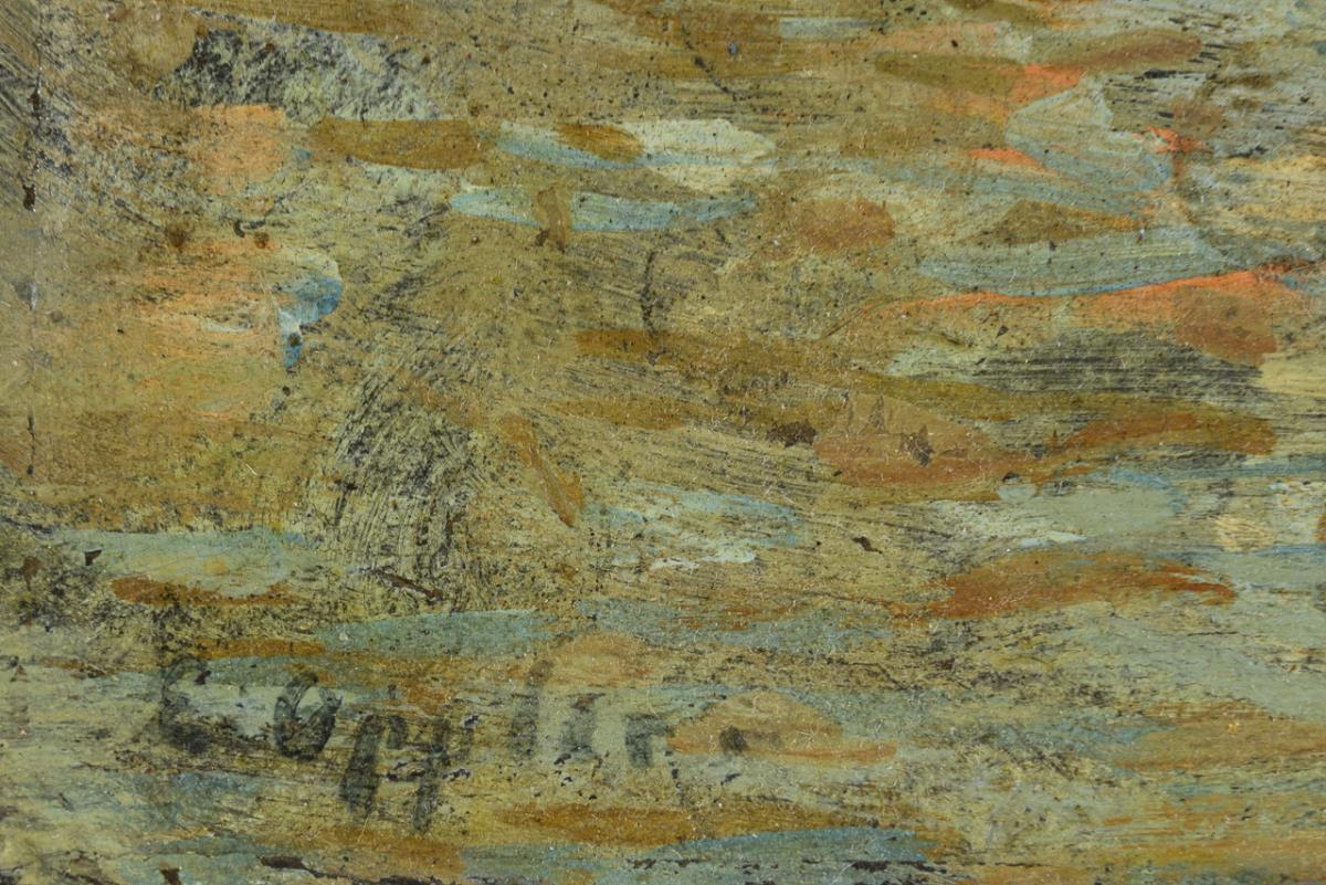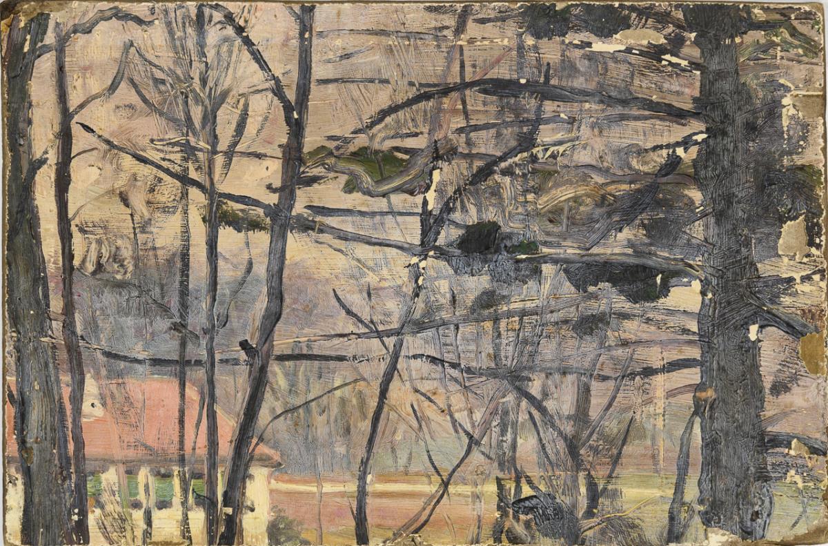 Öl/Malkarton. Links unten signiert, verso Landschaftsbild mit Haus und kahlen Bäumen.