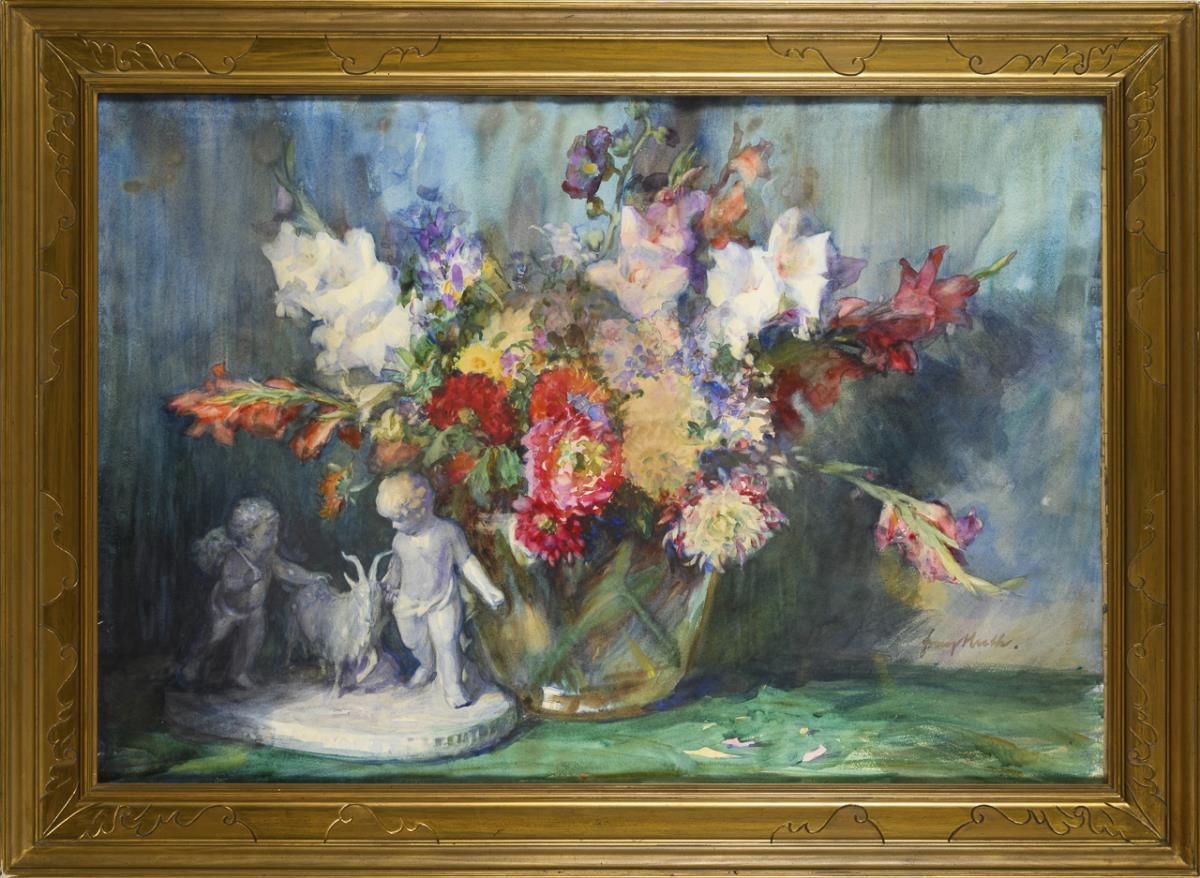 Großer Strauß mit leuchtenden Blüten neben Porzellanfigur mit zwei Hirtenjungen und einer Ziege. Am oberen Rand Feuchtigkeitsschaden.