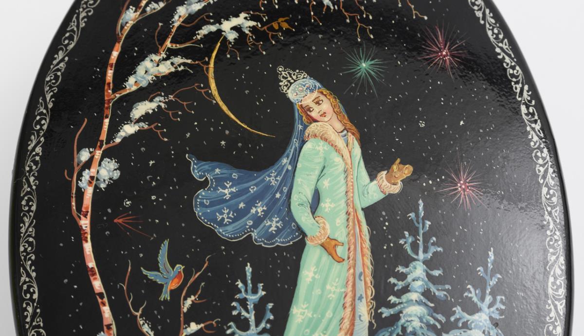 Polychrome, goldstaffierte Malerei auf schwarzem Lack. Maximal 4 x 14 x 10 cm.