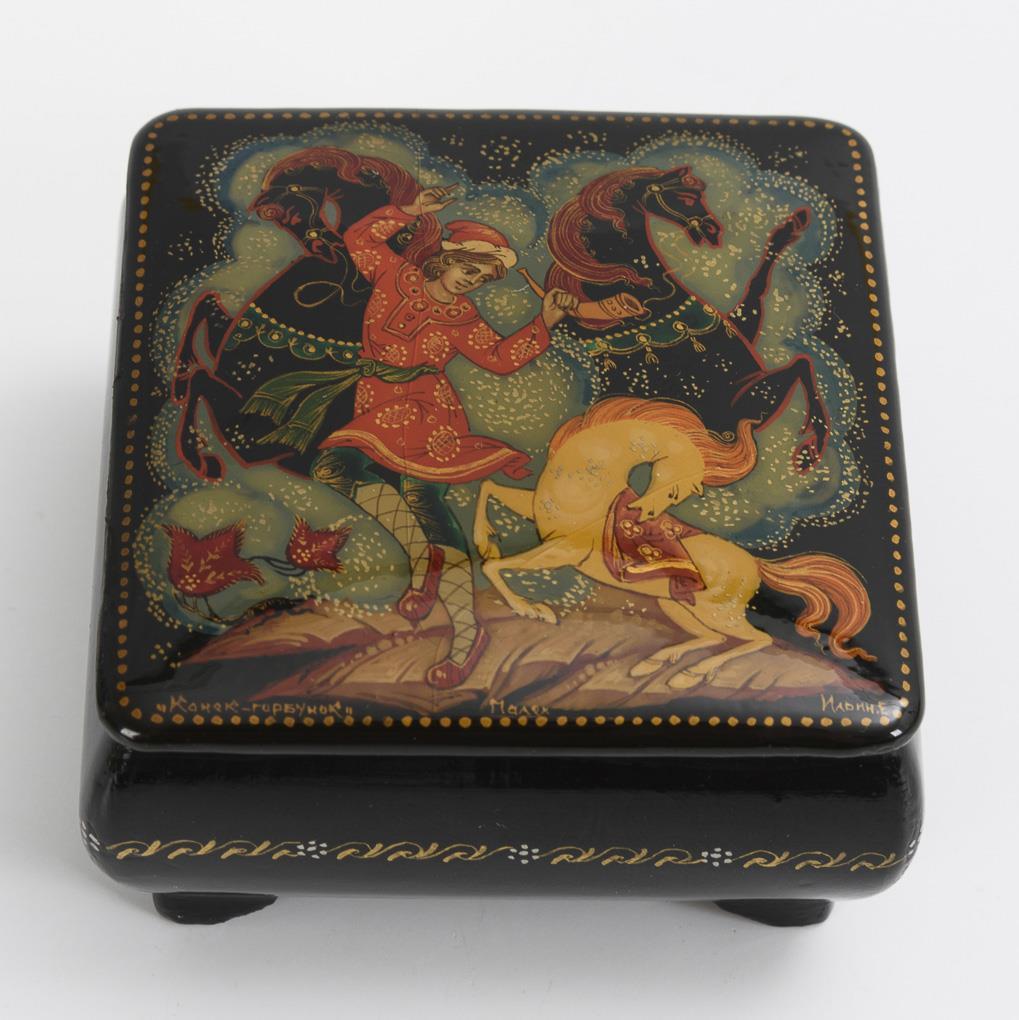 2x Fedoskino (1x mit Datum "98"), 2x Cholui, 2x Palech bezeichnet, je kyrillisch bezeichnet. 2. Hälfte 20. Jh.