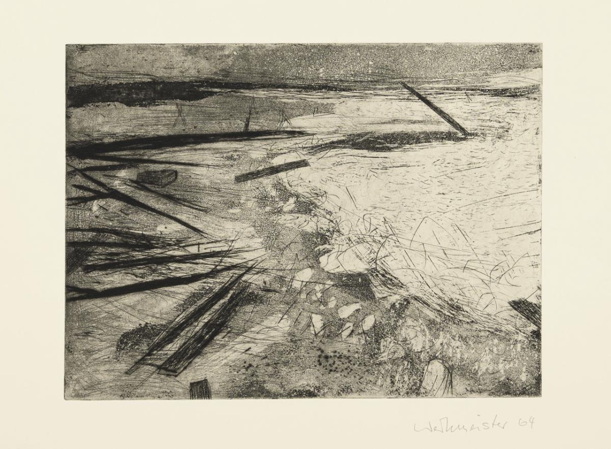 "Strandgut", [19]64, Druckplatte: 21,3 x 28,4 cm, Blatt: 38,5 x 53,5 cm | "Nächtlicher Hafen", [19]66, Druckplatte: 33,5 x 48,5 cm, Blatt: 53,5 x 77 cm.