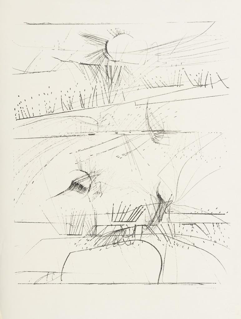 Abstrakte Komposition, Radierung, Bleistiftsignatur, [19]74, Druckplatte: 30,7 x 42 cm, Blatt: 49,8 x 64,8 cm, Randbereich knickspurig | Motiv für Plakat der Griffelkunst, Lithografie, Wasserzeichen Griffelkunst-Vereinigung Hamburg e.V., Bleistiftsignatur, [19]67, Blatt: 63 x 49,3 cm, Randbereich knickspurig.