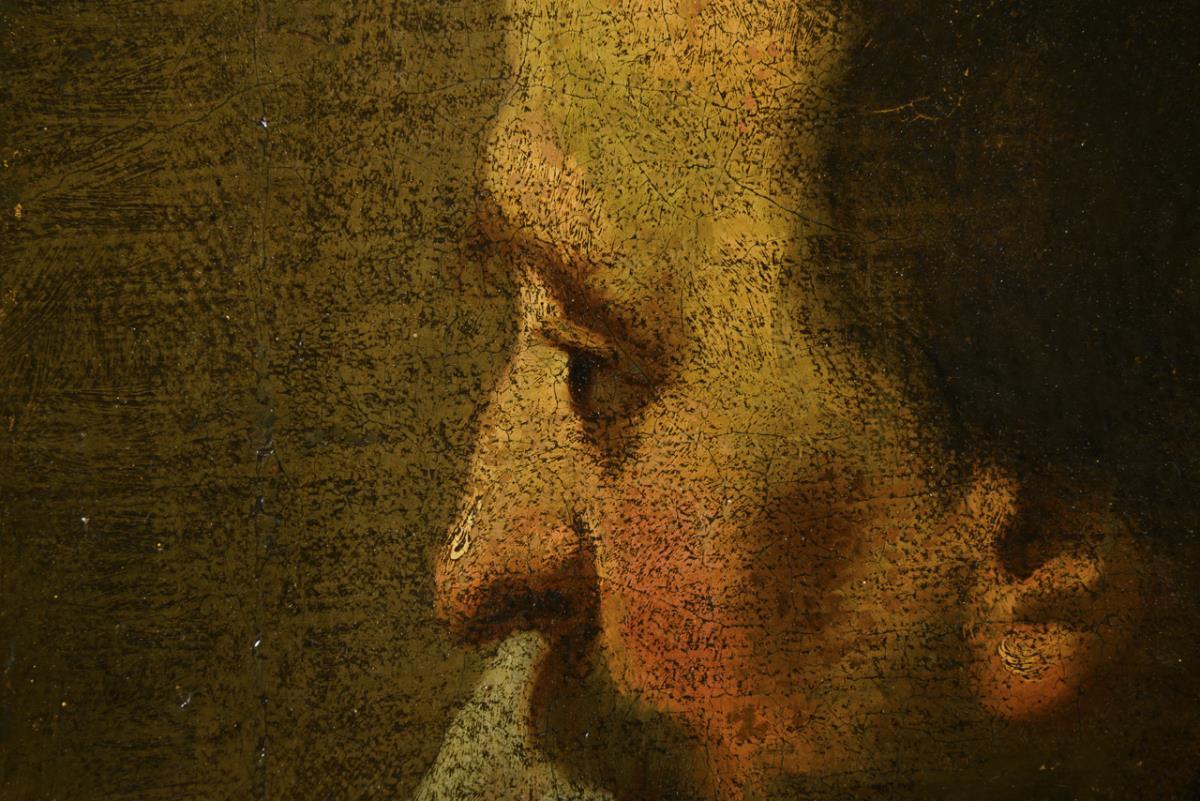 Gespannt und aufmerksam nach links blickender Mann mit Bart und langem Haar, der das Ende eines Stabes umklammert, während sein Gesicht im ausdrucksstarken Profil bei hellem Licht charakterisiert ist. Restauriert, einige Alterspuren.