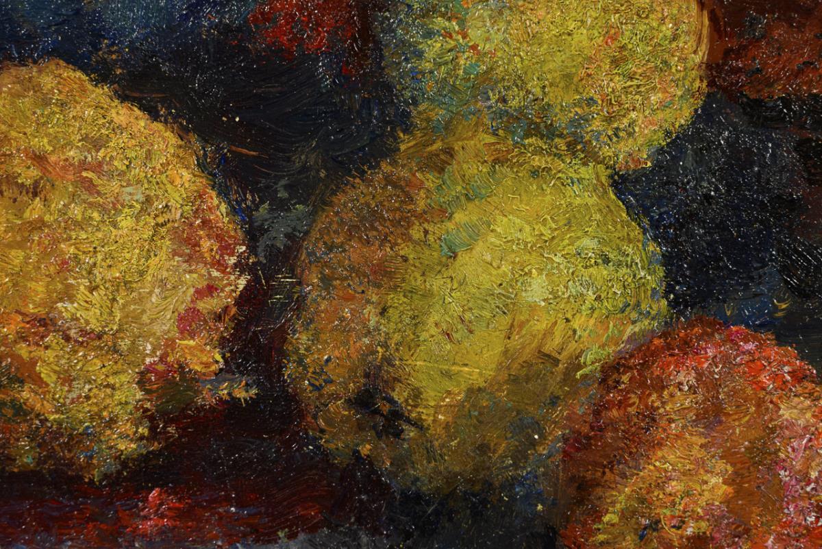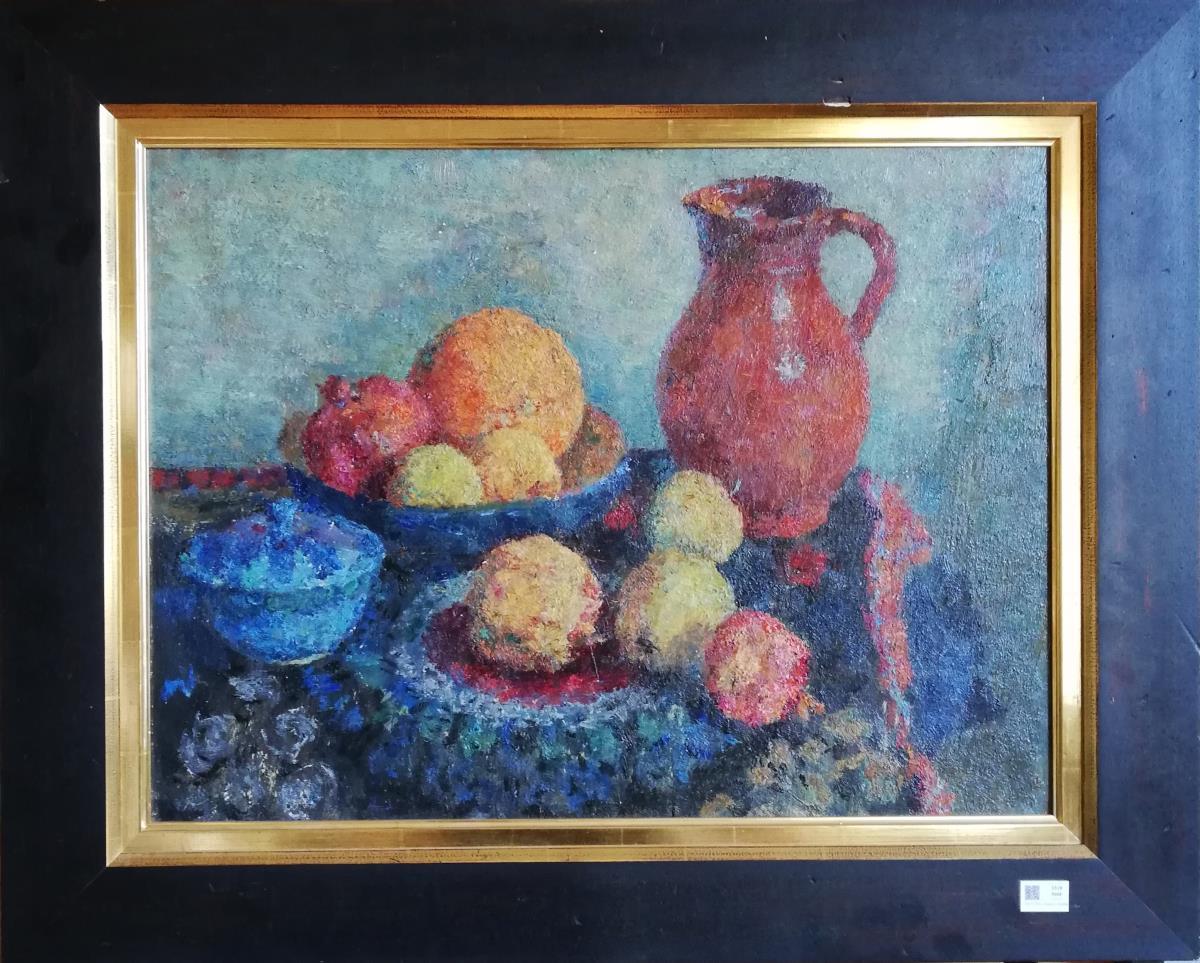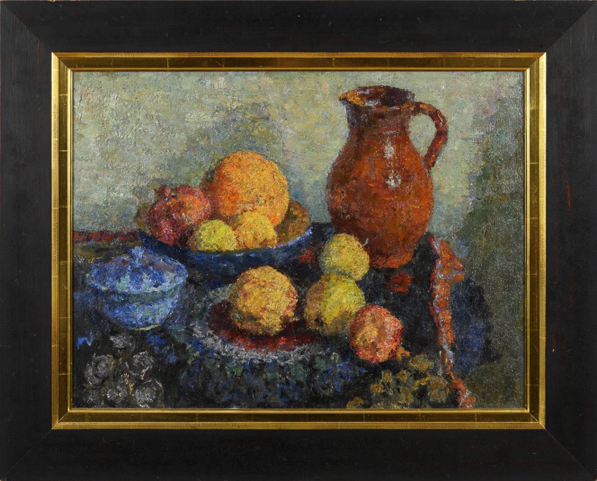 In kräftigen Farben gemalte Früchte auf einem Teller und in einer Schale neben Dose und Kanne auf einem Tisch | Nachtrag 3.11.23: Rahmen mit leichten Defekten. Minimale Altersspuren.