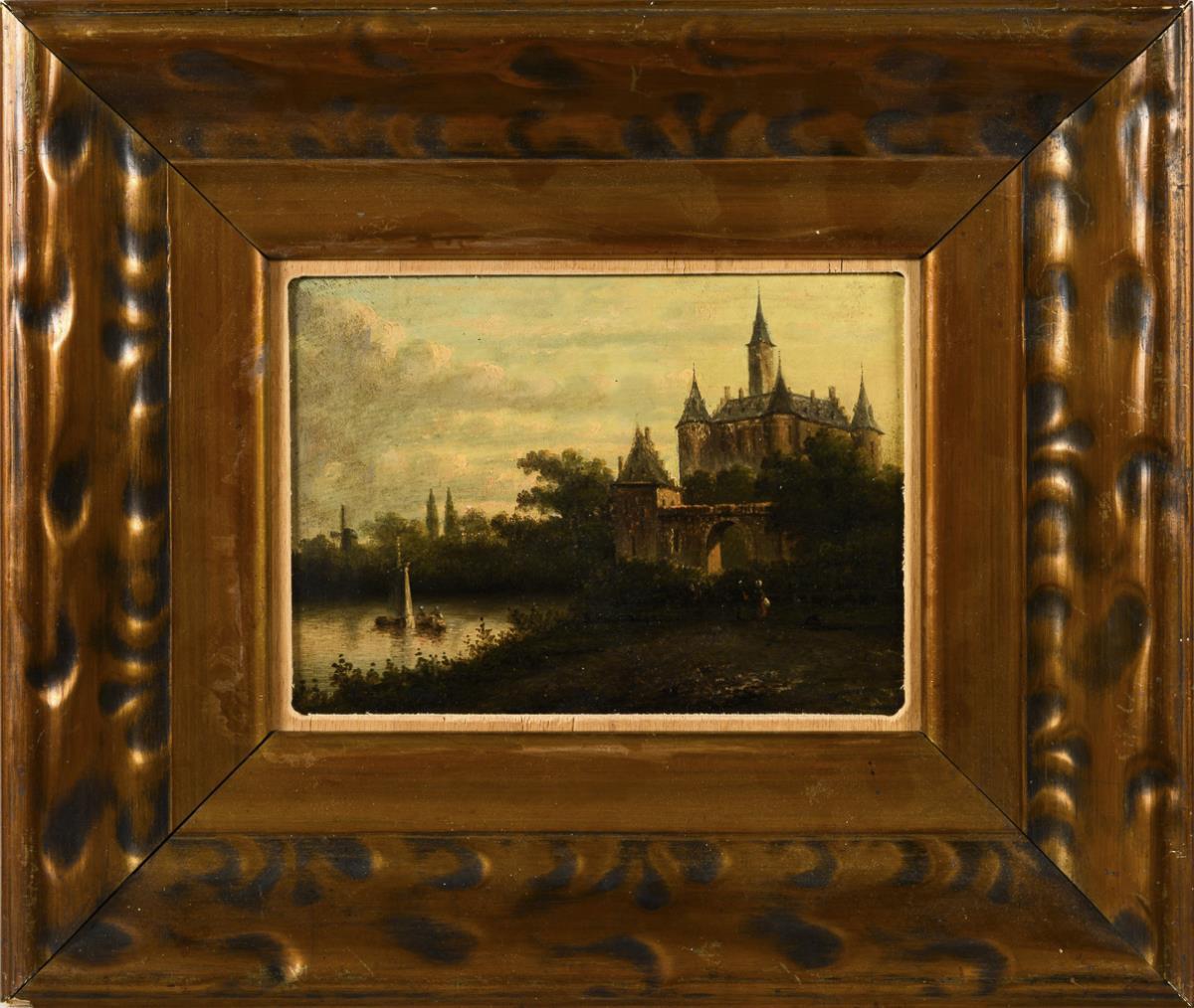 Landschaft mit Staffage nahe einem Tor und dem Schloss im warmen Sonnenschein. Leichte Altersspuren.