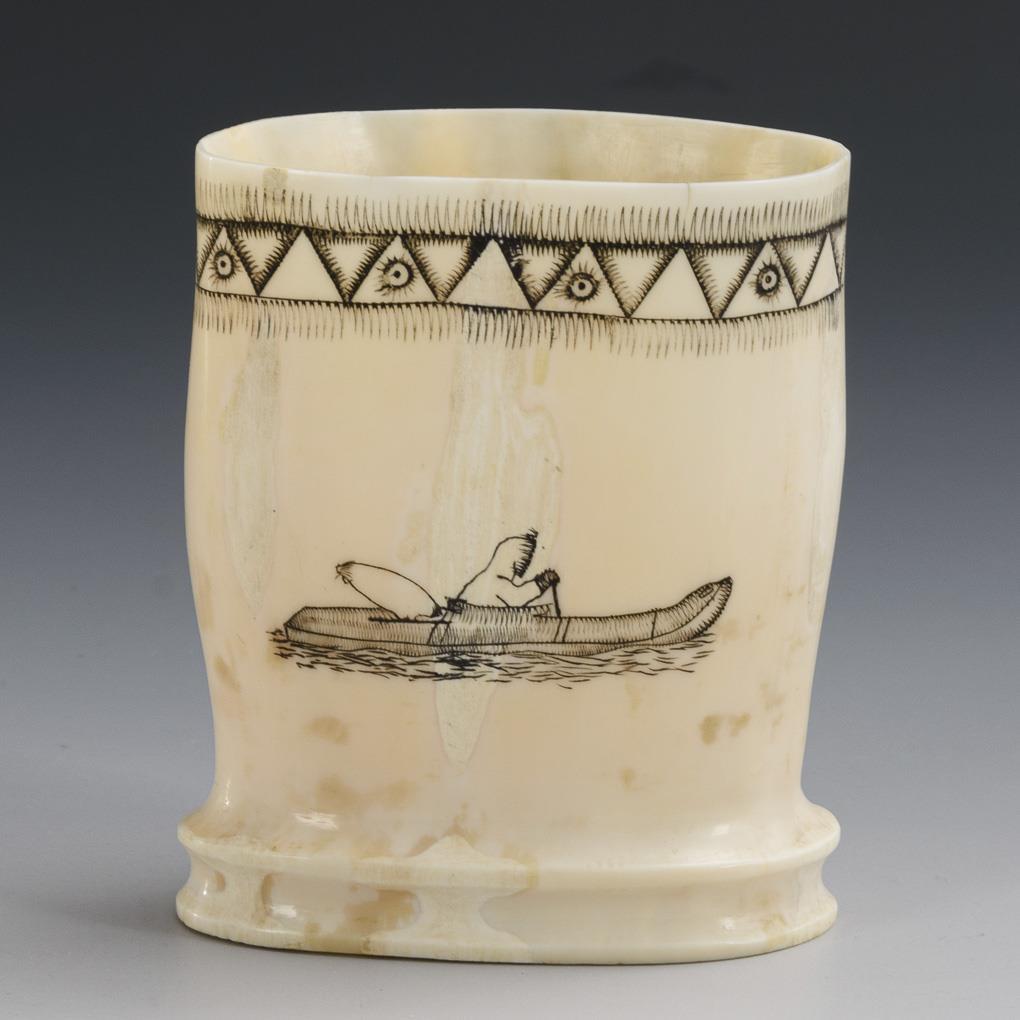 In Scrimshaw-Technik fein gravierter Becher mit der Darstellung eines Inuits im Kajak bzw. einer Robbe und eines Eisbären. Profilierter Fuß und ornamentierter Lippenrand.