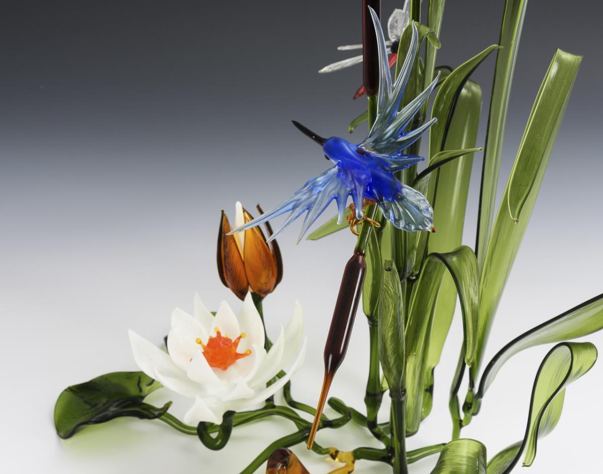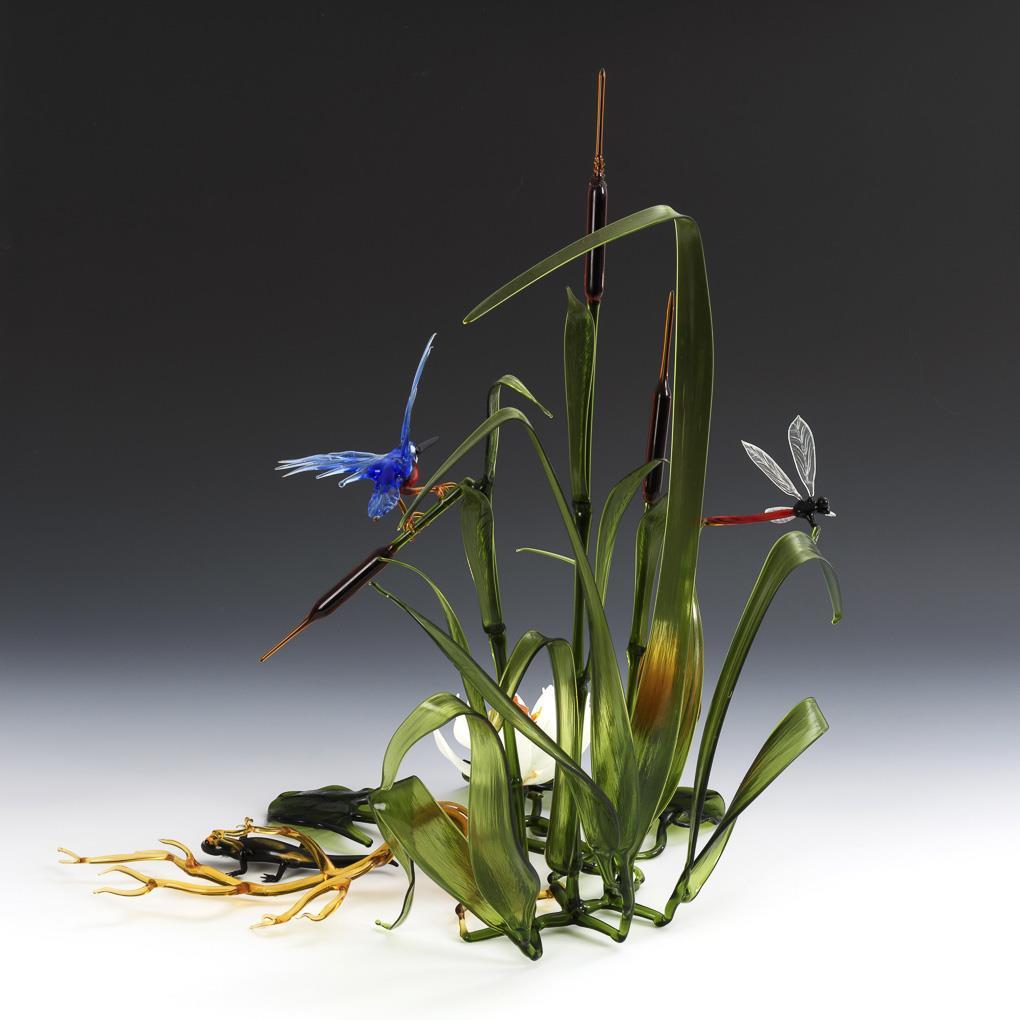 Unikat. Uferstück mit Schilf, Seerose und Wurzel, mit einem Eisvogel, einer Libelle und einem Salamander. Spitze eines Seerosenblattes restauriert.