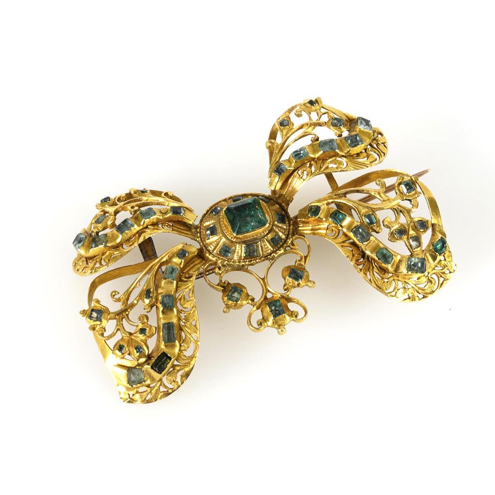 Filigrane, schleifenförmige Brosche mit zentral zargengefasstem Smaragd und 49 kleineren. Hakenverschluss. Broschierung ergänzt. Wohl kleine Öse fehlt.