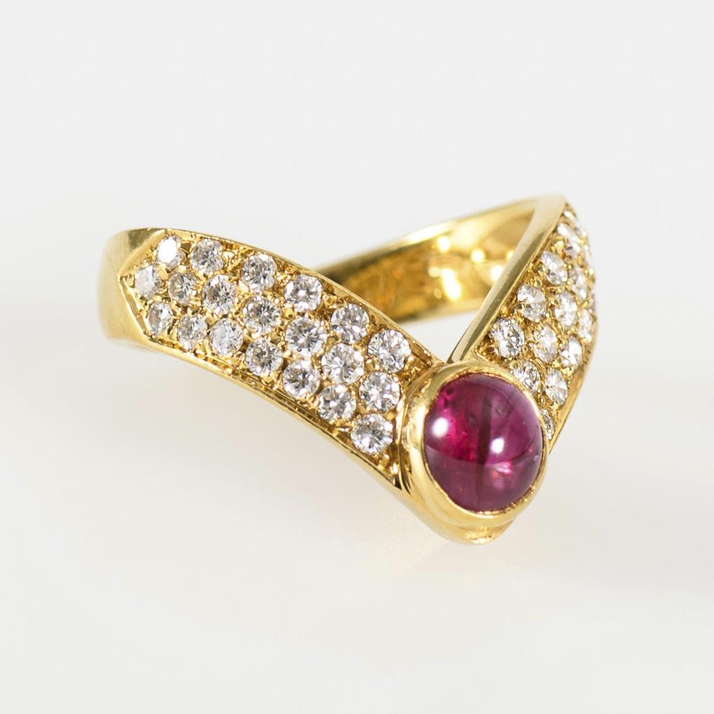 Zargengefasser Rubin und 40 eingelassene Brillanten, zwischen v-förmiger, mittlerer Schiene.