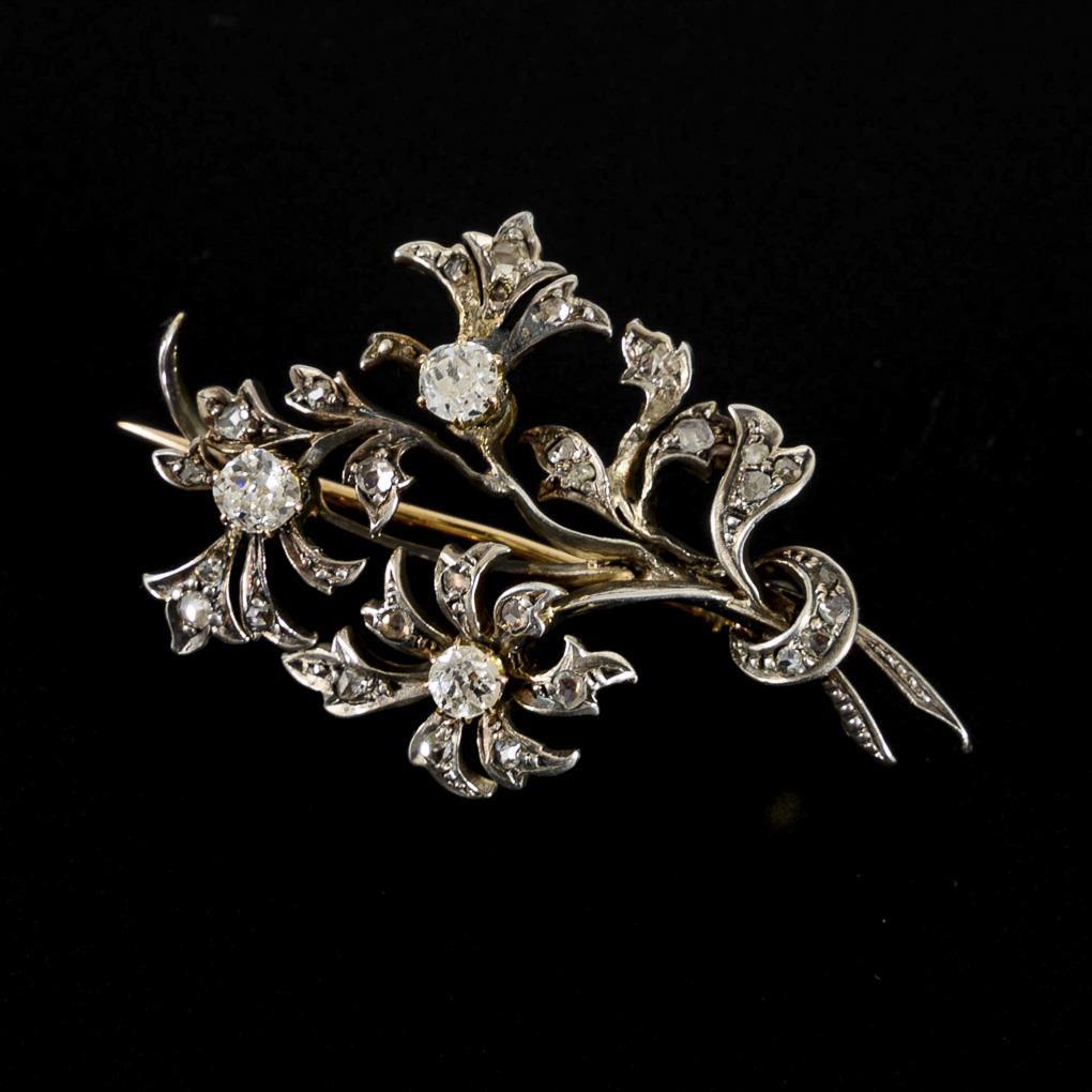 Blütenzweig mit 3 chatongefassten Altschliff-Diamanten und diversen, kleinen eingelassenen Diamantrosen. Hakenverschluss. Broschierung und 1 Blütenblatt restauriert.