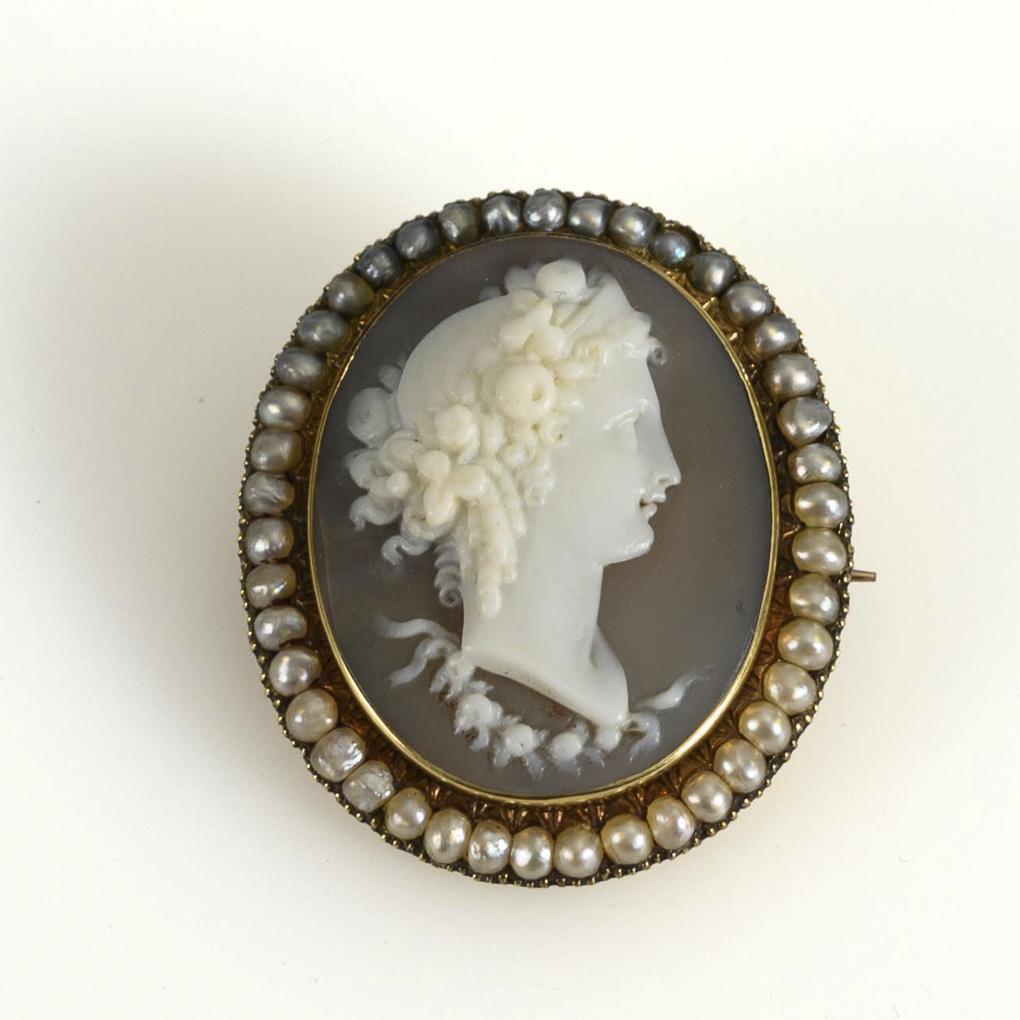 Kamee mit fein geschnittenem Frauenprofilkopf, umgeben von Saatperlen, in geschlossener Zargenfassung. Hakenverschluss, Hakenöse. Nadel und Öse ergänzt.