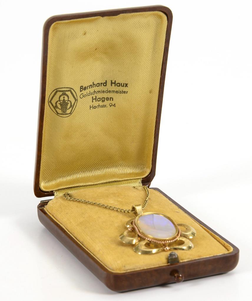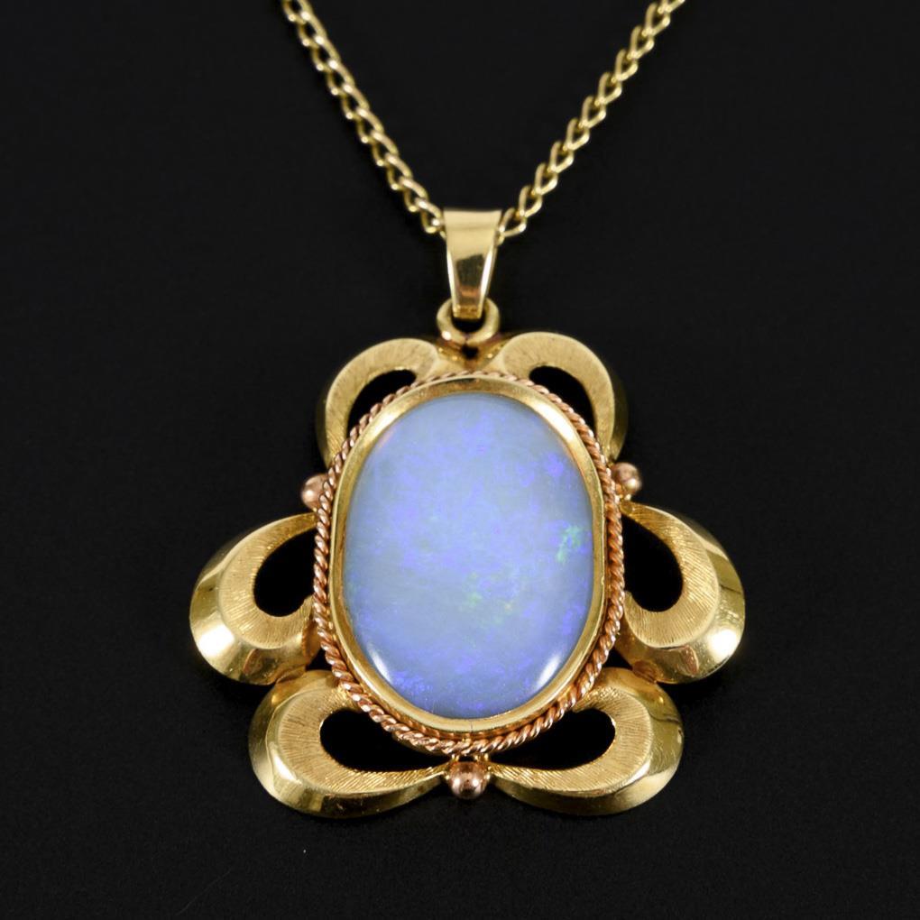 Gelbgoldanhänger 585 gestempelt. Gelbgoldkette 333 gestempelt. Opal ca. 9,40 ct. 20 x 15 x 5,5 cm. Anhänger 4 x 3,5 cm. Kette L 45 cm. Anhänger 7,9 g/Kette 2,7 g.