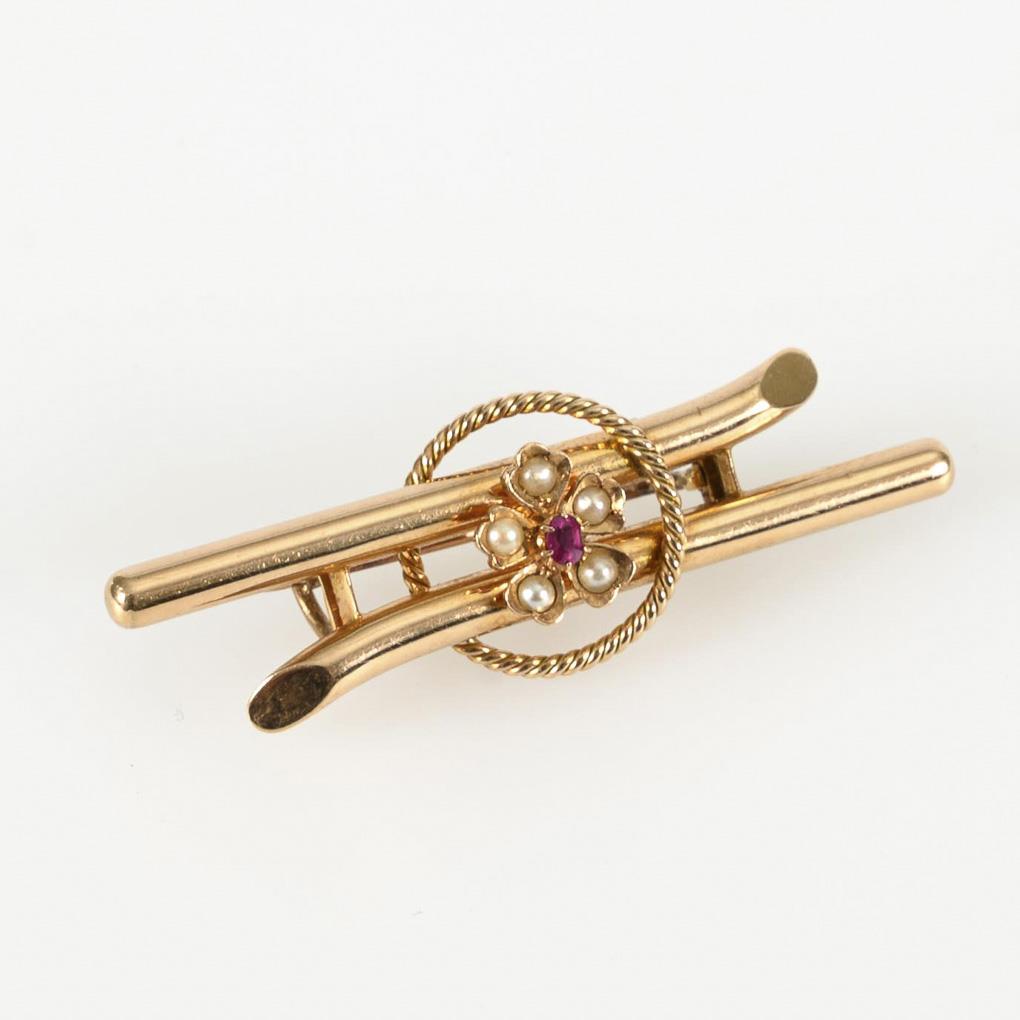 Auf Doppelstegbrosche perlchenbesetzte Blüte mit kleinem Rubin. Hakenverschluss.