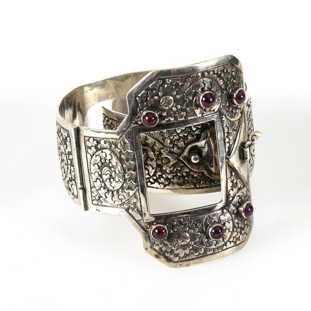Rankenreliefierter Reif in Gürtelform mit 8 zargengefassten Rubincabochons. Achtersicherung.