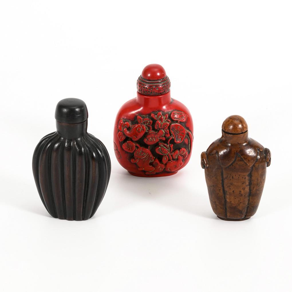Flache Flaschenform aus geripptem, dunklem Holz. / Beschnitzte Flasche aus gemasertem Wurzelholz, mit zwei Schafsköpfen als 'Handhaben'. / Rote, schwere Flasche aus korallenroter Masse mit Fischen und Lotosblüten als Relief. Alle mit passenden Stöpseln.